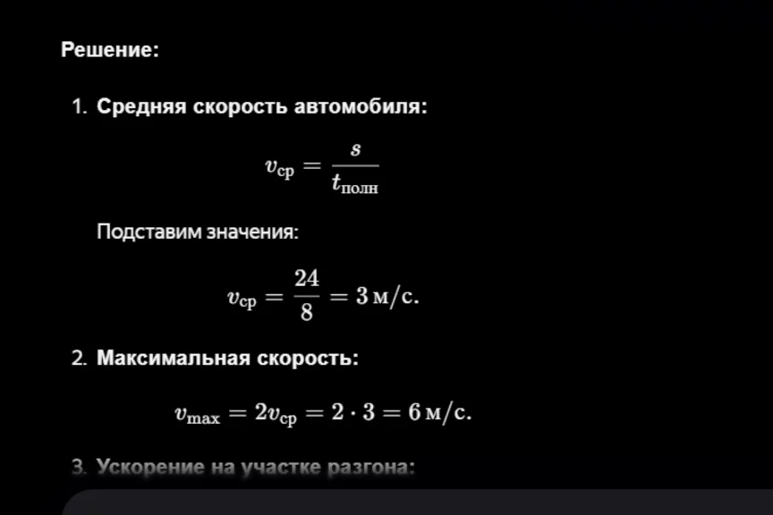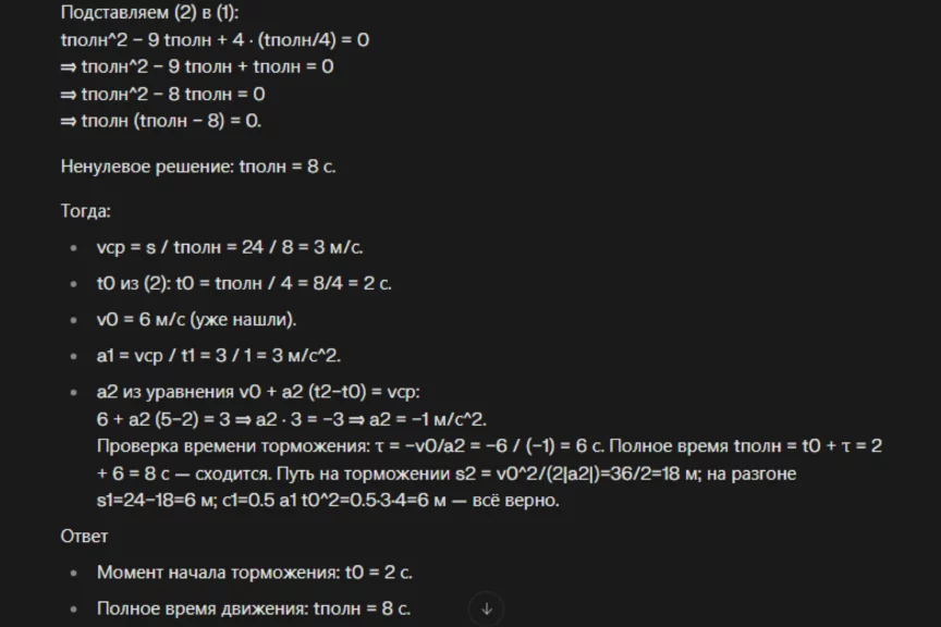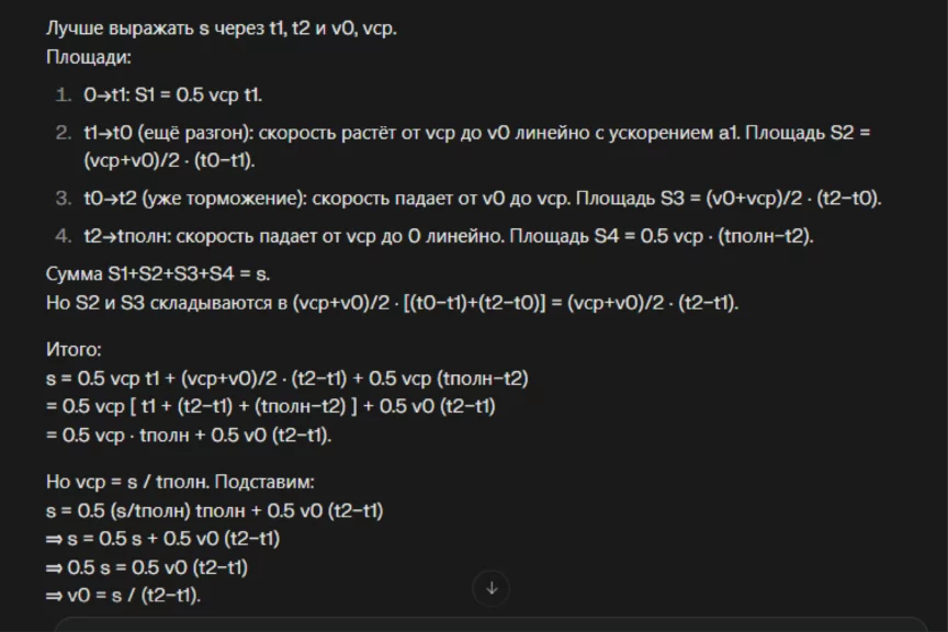 Второй запрос — на построение графика: «Изобрази график зависимости мгновенной скорости автомобиля от времени и покажи на нем уровень средней скорости 𝑣ср и максимальной достигнутой скорости 𝑣𝑚𝑎𝑥, момент начала торможения 𝑡0 и полное время в пути 𝑡полн.».