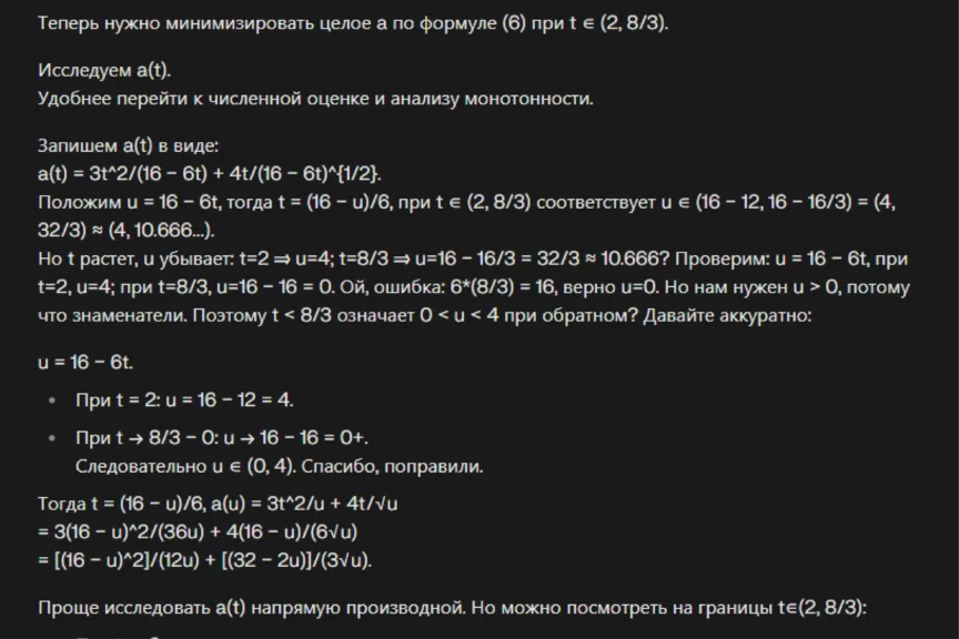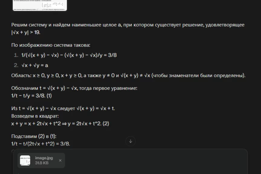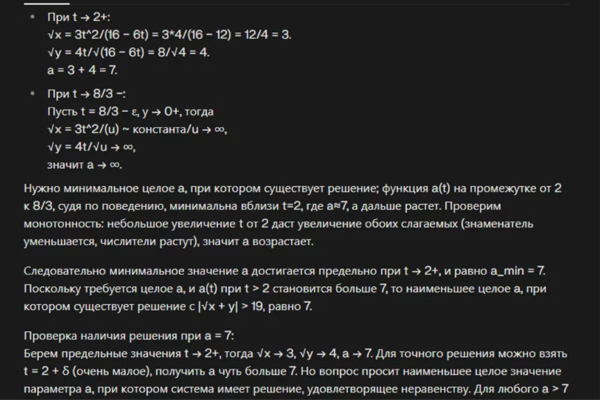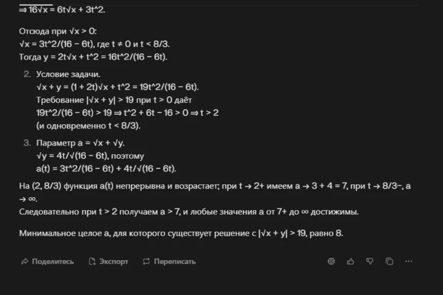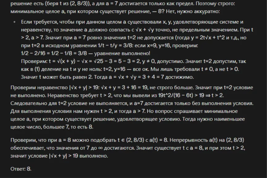 ChatGPT 5.0 ответственно подошел к решению задачи, подробно расписал каждый шаг и выдал правильный ответ: a = 8.