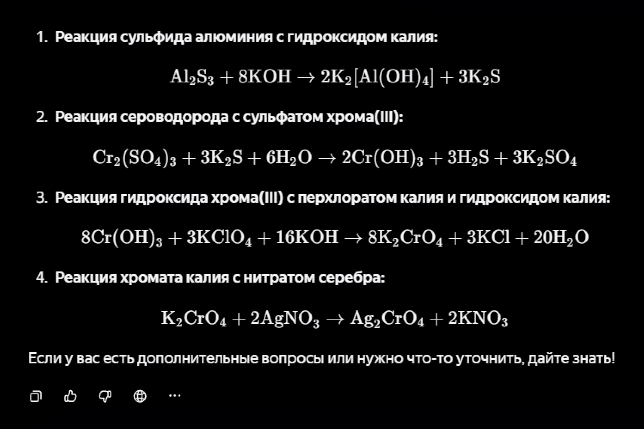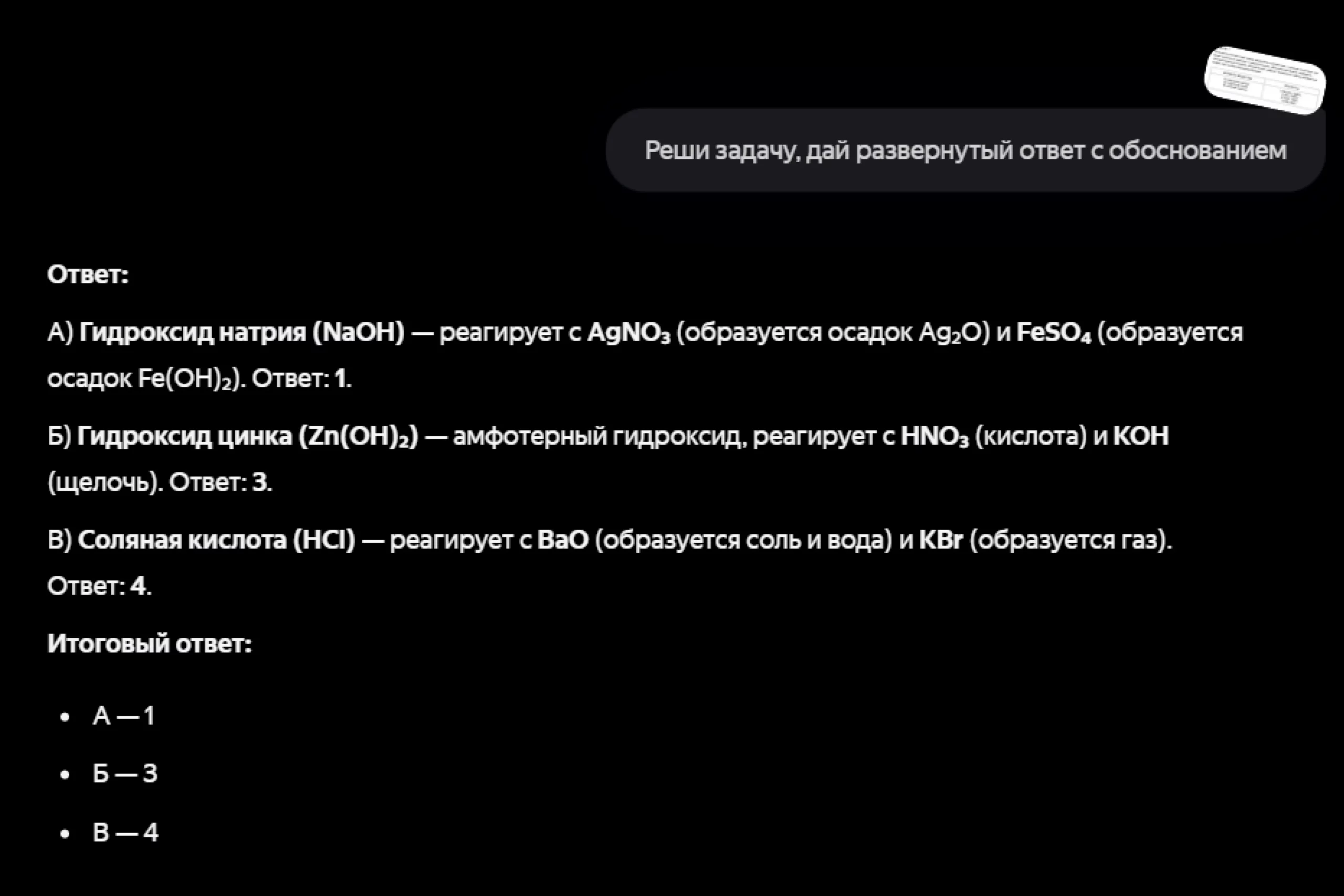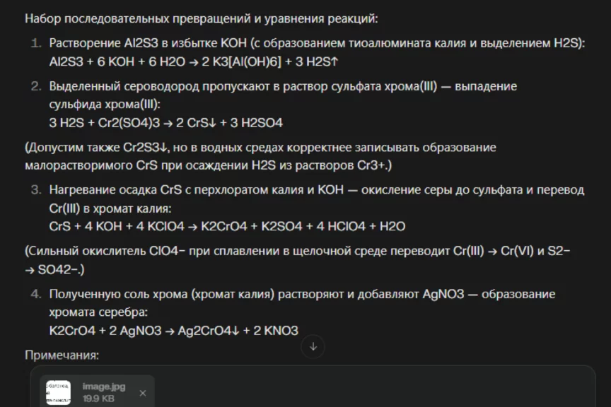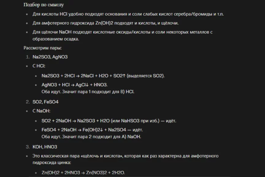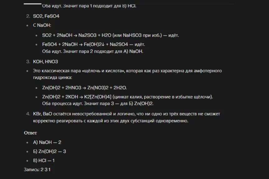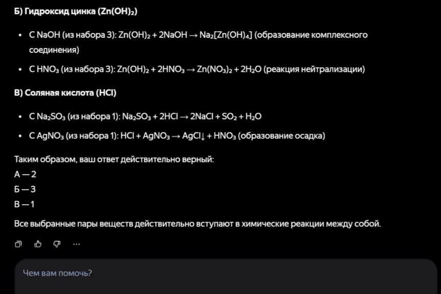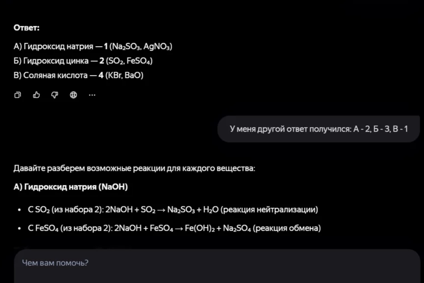 А вот Алиса удивила, дав ответ, максимально близкий к правильному, но без указаний воздействия (нагрева) и выделения вещества (выпадения в осадок и выделения газа). Нельзя сказать, что за это решение нейросеть от «Яндекса» получила бы высший балл (поэтому и мы поставим полбалла), но справилась она однозначно лучше ChatGPT.