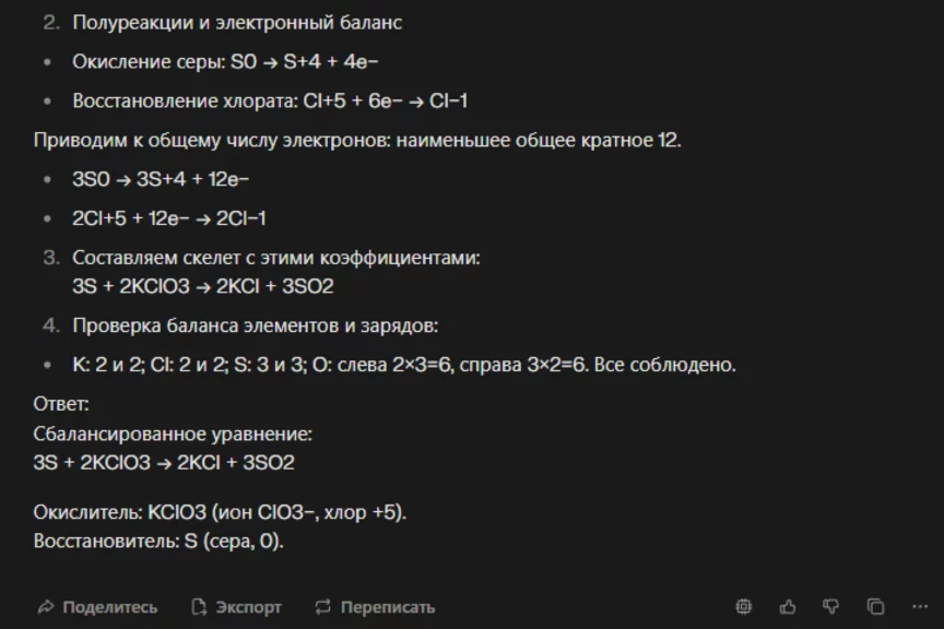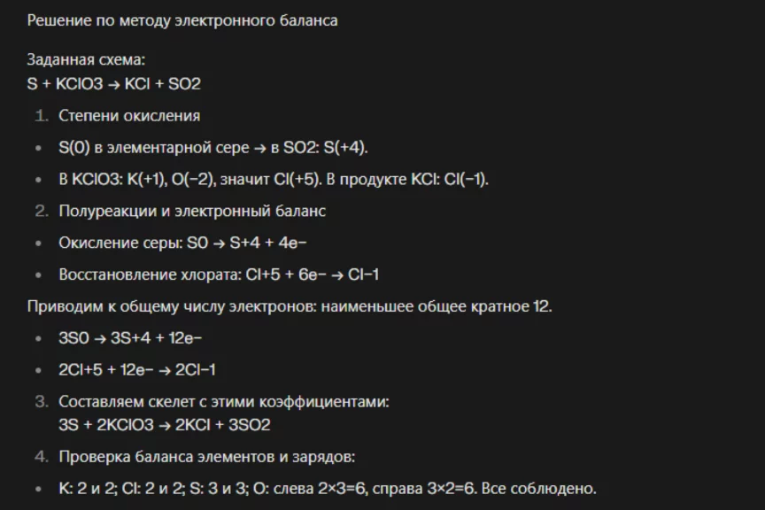 Чтобы получить максимальный балл, ChatGPT должен определить степень окисления и составить баланс, расставить коэффициенты в исходном уравнении и определить окислитель и восстановитель.