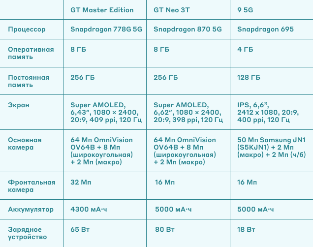 Для начала сравнительная таблица, в которой собраны исключительно главные технические характеристики смартфонов, причем только те, что позволяют понять предназначение устройств. А именно, позиционировать GT Master Edition как камерофон, GT Neo 3T как игровой, а 9 5G как максимально автономный даже при том, что у него самый большой экран.