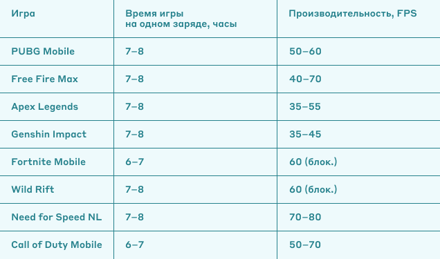 Как уже было сказано, процессор относится к среднему сегменту с точки зрения производительности, но его возможностей вполне достаточно для игр на высоких и максимальных настройках. Результаты замеров производительности приведены в таблице ниже. В зависимости от настроек смартфона (профиль производительности, яркость экрана, тип подключения к сети), время автономной работы может быть как меньше, так и заметно больше.