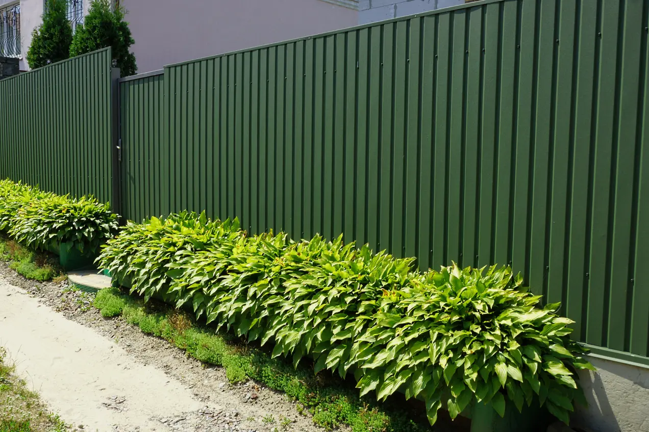 Такие ограды высокие и прочные — враг не пройдет. Но стоит профнастил дороже дерева, установка требует больше сил, да и эстетически он не так приятен, как дерево или рабица.