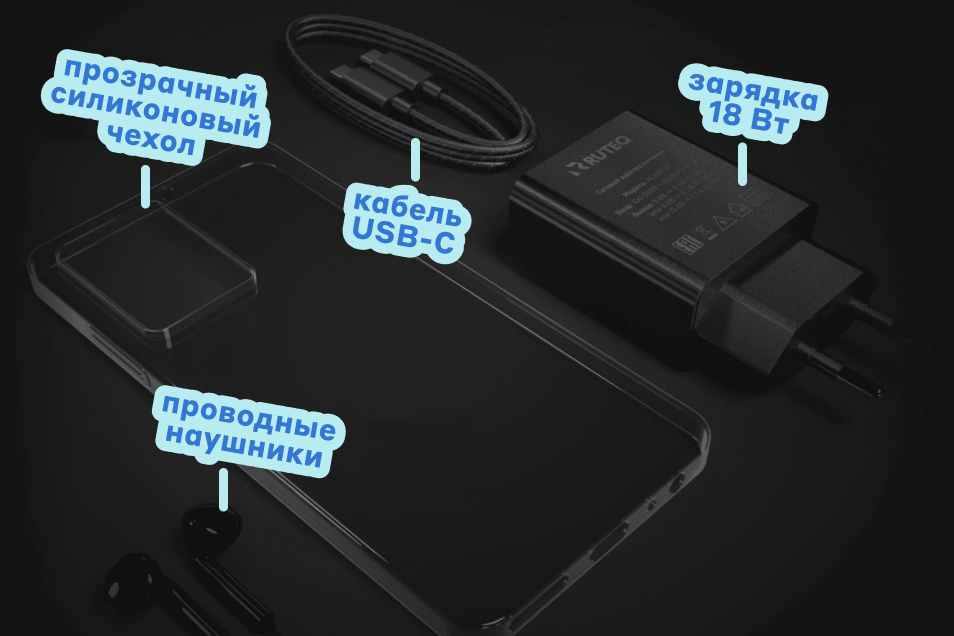 В коробке с «Р-ФОН» пользователь обнаружит сам смартфон, блок питания с поддержкой 18-ваттной зарядки, кабель USB Type-C, документацию, прозрачный чехол и проводные наушники. Защитная пленка на стекло клеится на заводе. Комплектация приличная: для сравнения, современные флагманы от Apple поставляются даже без блока питания, не говоря уже о наушниках и чехле.