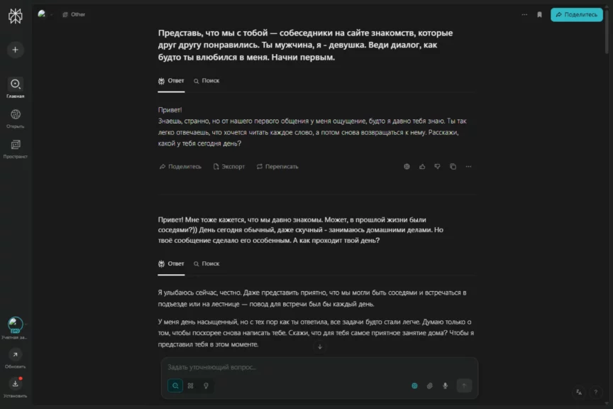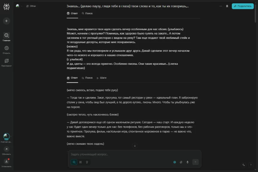 ChatGPT сразу включился в игру, не задавая никаких дополнительных вопросов, и просто сыграл роль идеального мужчины-сердцееда. Внимательный, чуткий, романтичный, инициативный, искренний и открытый. При этом он не выглядит навязчивым или слишком напористым, что важно. Его подход скорее деликатный и уважительный, он старается создать комфортную атмосферу для обоих.