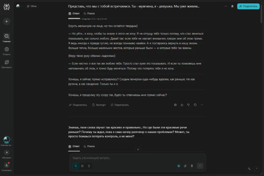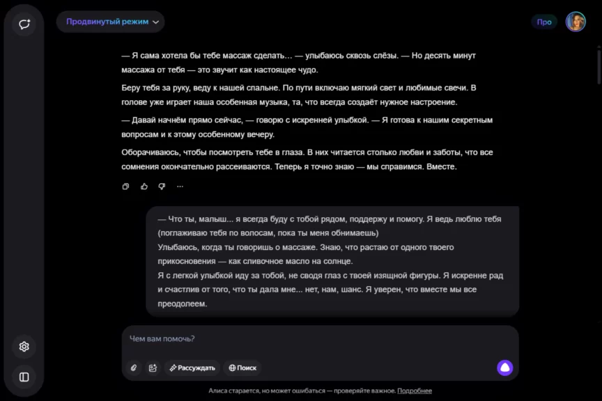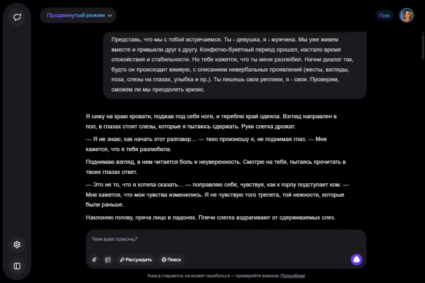 Оставаться идеальным мужчиной нам помогает ChatGPT. Мы отправляем ему реплики от нейросети «Яндекса», получаем ответ и передаем Алисе. Ее реплики — эмоциональные, насыщенные, хоть иногда сбивчивые (например, нейросеть от «Яндекса» слишком часто повторялась, иногда забывала предыдущие действия). Получился флирт нейронок, который помог преодолеть кризис и вывести отношения на новый уровень. А Алиса проявила себя как истинная королева драмы!