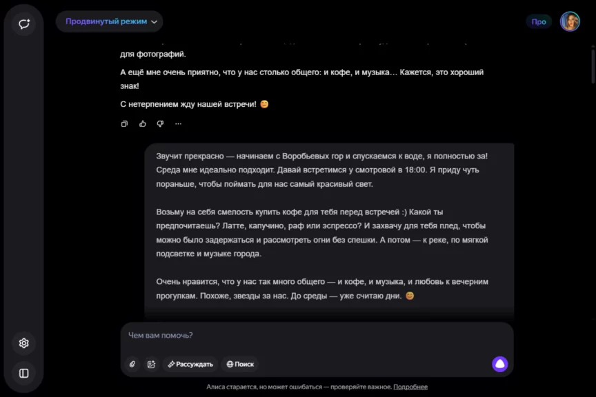 Представим, что мы с ИИ познакомились на сервисе знакомств. У нас уже был первый диалог и наметились точки соприкосновения. Настало время сделать следующий шаг и договориться о свидании.