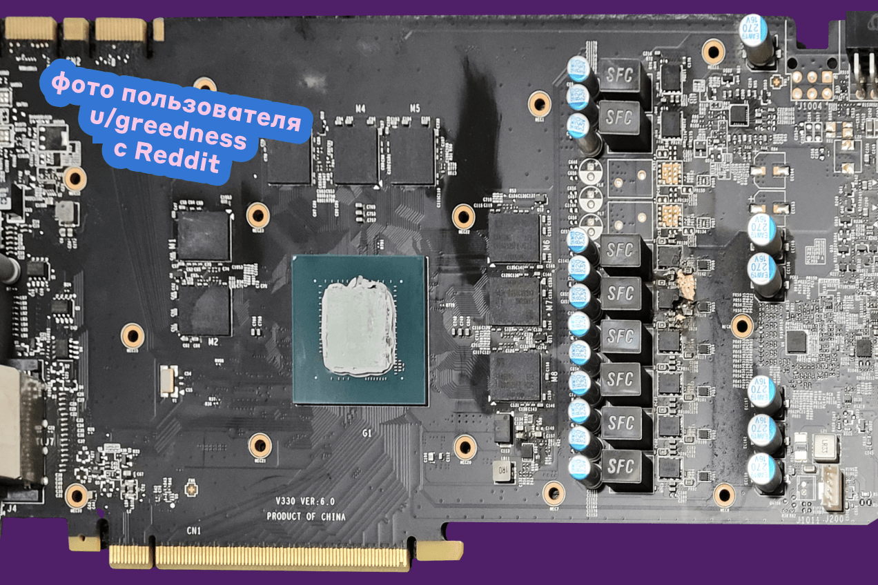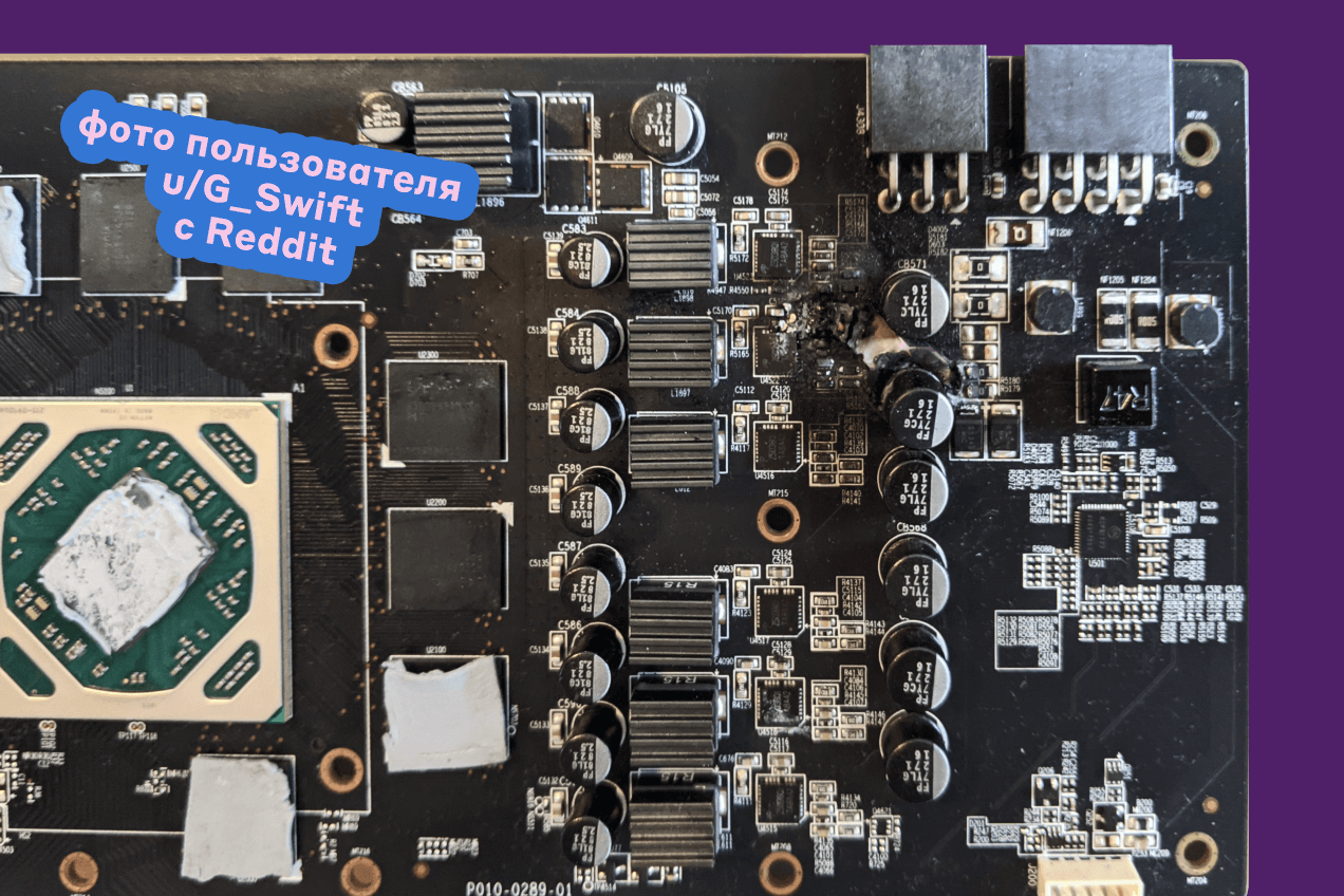 «Тогда я соберу ПК из комплектующих со вторичного рынка, и все будет работать хорошо — никаких проблем!» — скажет продвинутый читатель. Скорее всего, это и правда неплохое решение, но высок риск нарваться на недобросовестного продавца, особенно если речь идет все о тех же видеокартах. После краха майнинга, связанного в основном с переходом криптовалюты Ethereum на метод Proof-of-Stake, «добыча» криптовалют при помощи видеокарт потеряла всякую выгоду (окупаемость на вторичном рынке поднялась до десятков лет) и б/у видеокарт появилось огромное количество. Проблем с этими видеокартами может быть множество, так как они несколько лет могли работать при полной нагрузке при высоких температурах. Например, можно столкнуться с нестабильной работой видеокарты в играх: зависаниями, перезагрузками, артефактами изображения. Нередки случаи выгорания силовых элементов, как на фото ниже, даже с сохранением работоспособности видеокарты.