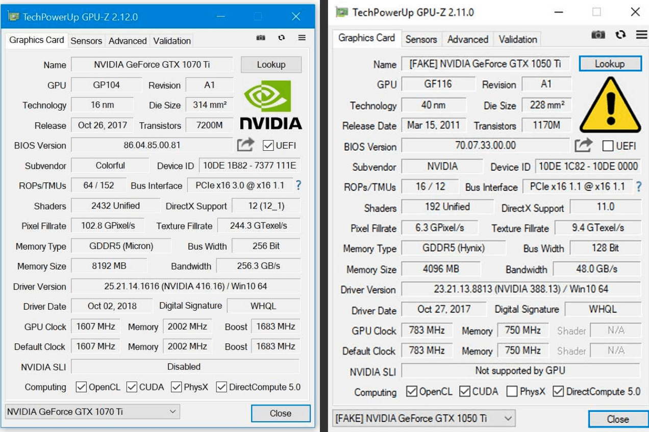 Такие видеокарты можно распознать при помощи программы GPU-Z, которая предупредит о том, что видеокарта не та, за которую себя выдает. Слева — результат проверки подлинной видеокарты NVIDIA, справа — поддельной, о чем свидетельствует большой восклицательный знак и надпись [FAKE] рядом с названием модели