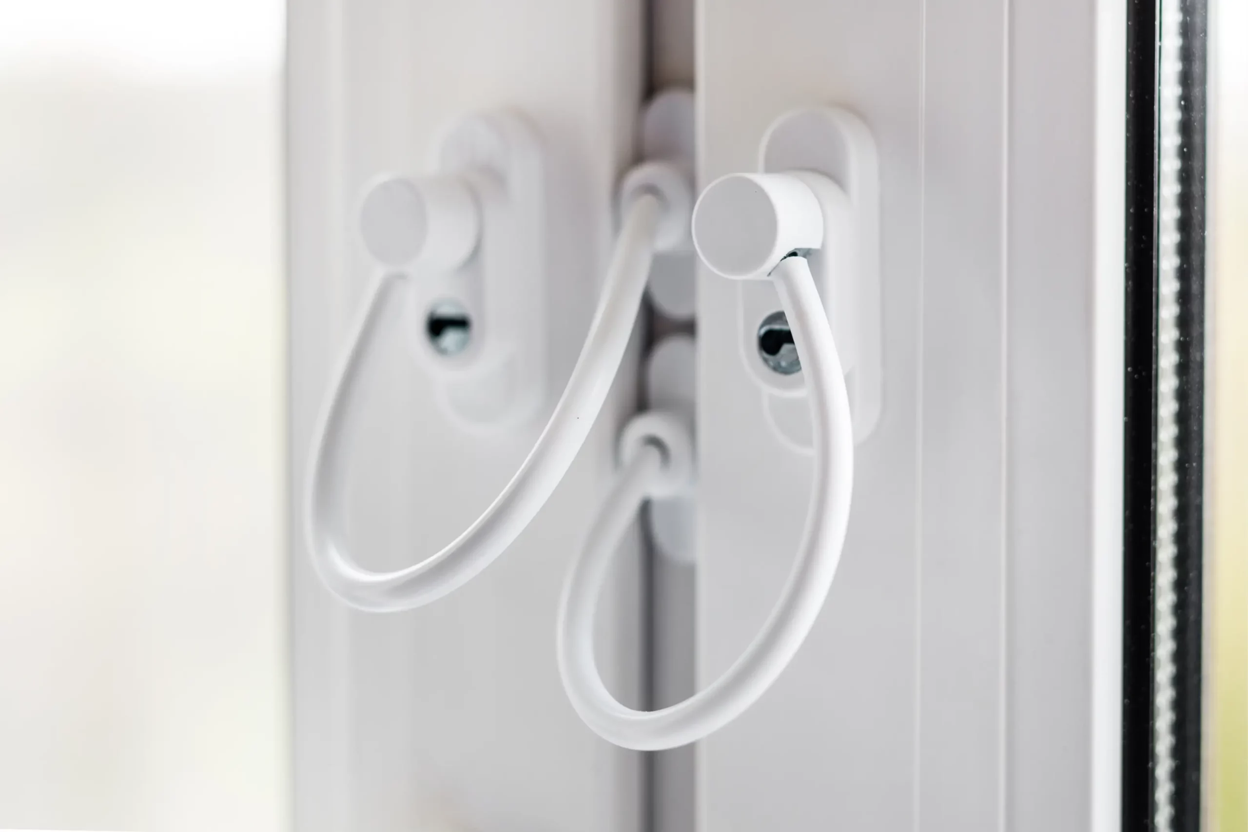 Это ручки для пластиковых окон с замочной скважиной и ключом. Они устанавливаются на место стандартных ручек — для этого нужно просто открутить болты, держащие ручку, заменить ее и закрутить болты. Замок позволяет зафиксировать ручку в нужном положении так, чтобы ее нельзя было повернуть без ключа. Например, можно приоткрыть окно на микропроветривание и зафиксировать это положение (повернуть ключ, вынуть его и нажать на скважину-кнопку) — тогда ребенок не сможет открыть окно полностью. Минус этого способа — придется все время следить за тем, вытащили ли вы ключ.