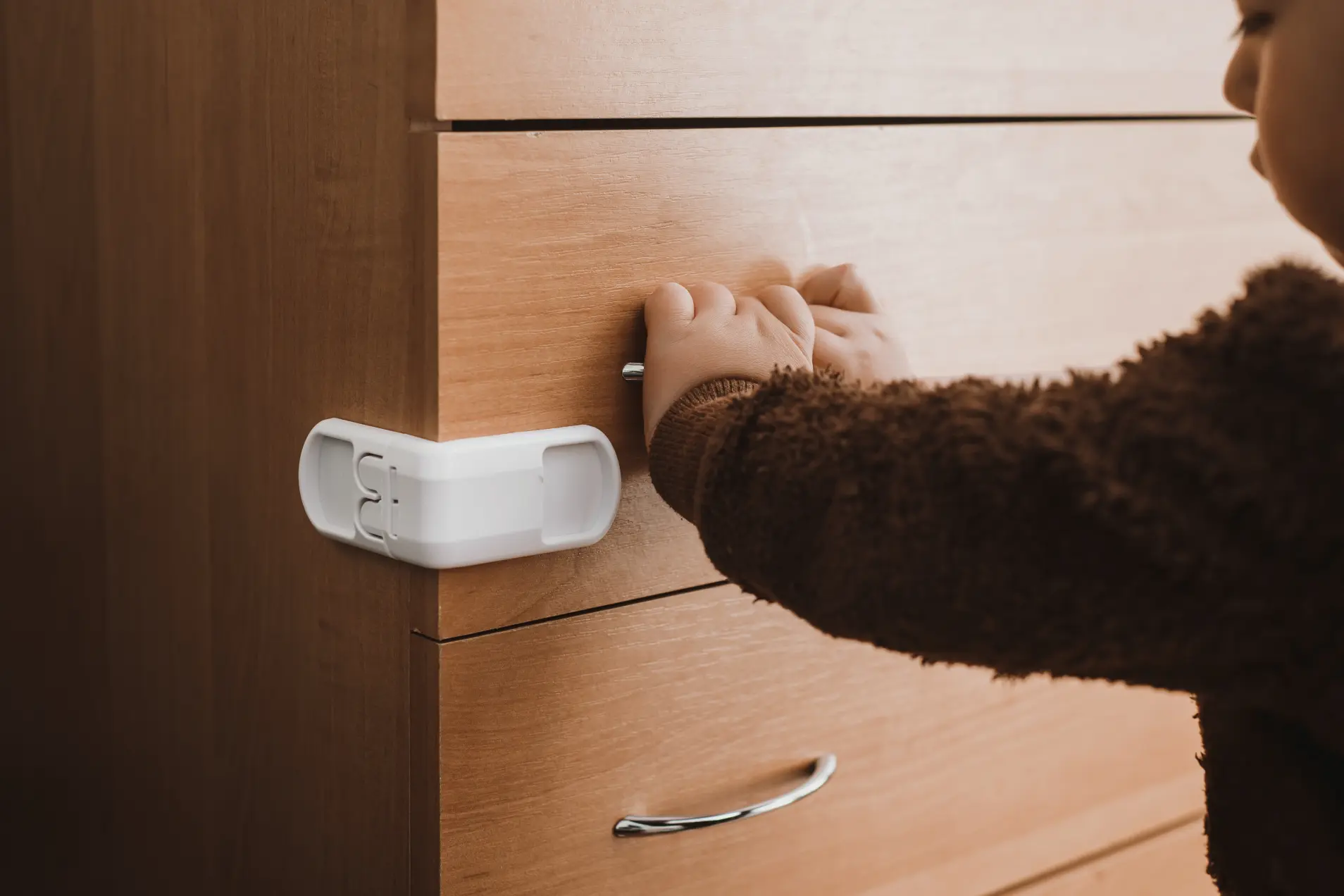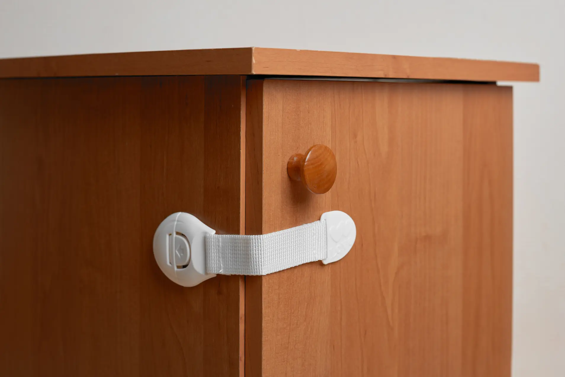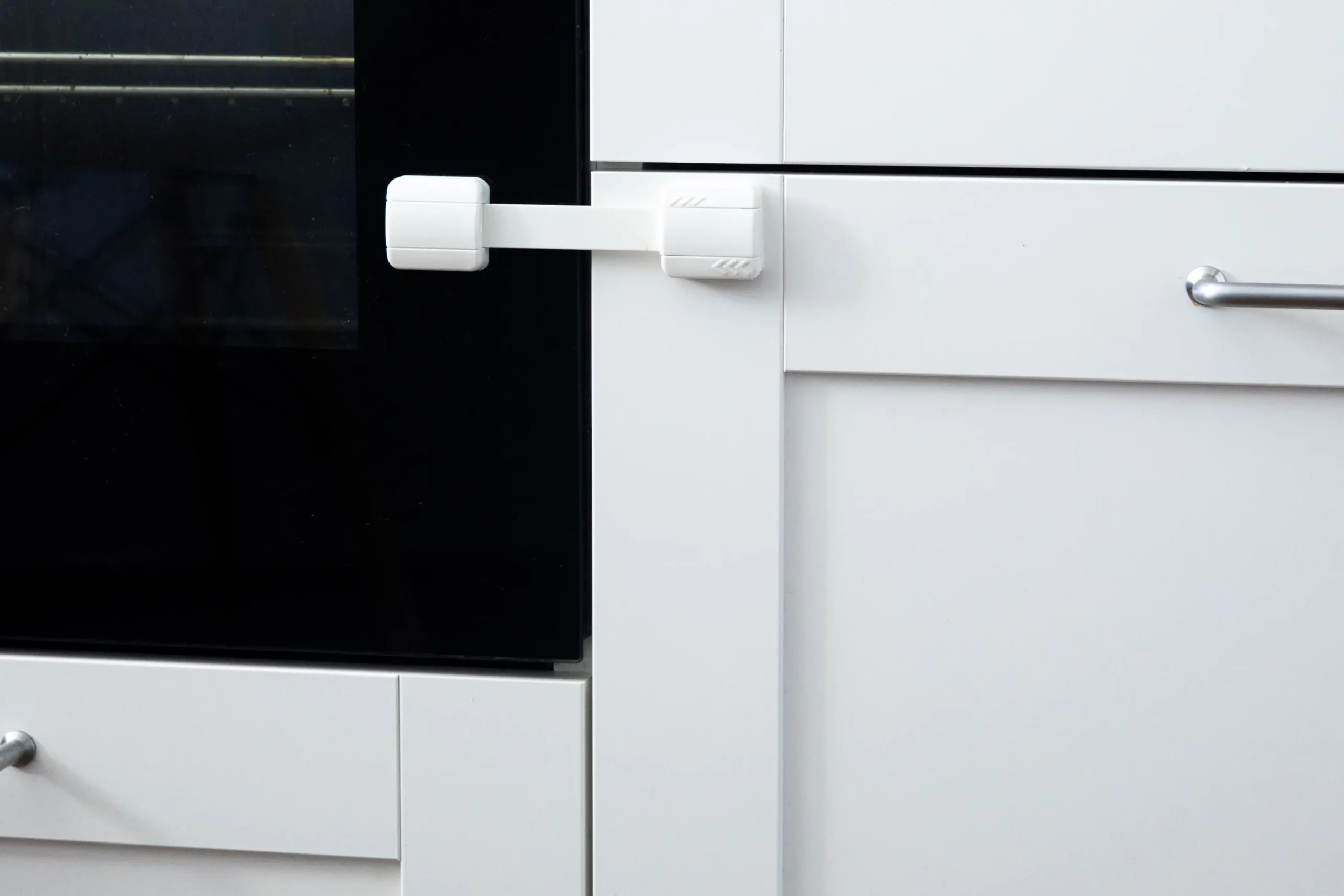 Самый простой способ не дать ребенку сунуть любопытный нос внутрь шкафчика — установить блокиратор. Самый базовый вариант — это две пластиковые плашки на двустороннем скотче, между которыми протянута плотная лента. Одна плашка крепится на статичную часть мебели, например на боковую сторону комода, другая — на подвижную часть. С помощью такого блокиратора можно закрыть практически все: микроволновку, выдвижные ящики холодильника, унитаз, ящики комода и так далее. Минус этой системы в том, что механизм запора очень простой — детки старше двух лет, скорее всего, научатся его открывать. Тогда можно попробовать повесить на ручки регулируемый блокиратор. Это тоже не панацея: он подходит только для распахивающихся дверок и тоже рано или поздно будет разблокирован ребенком.
