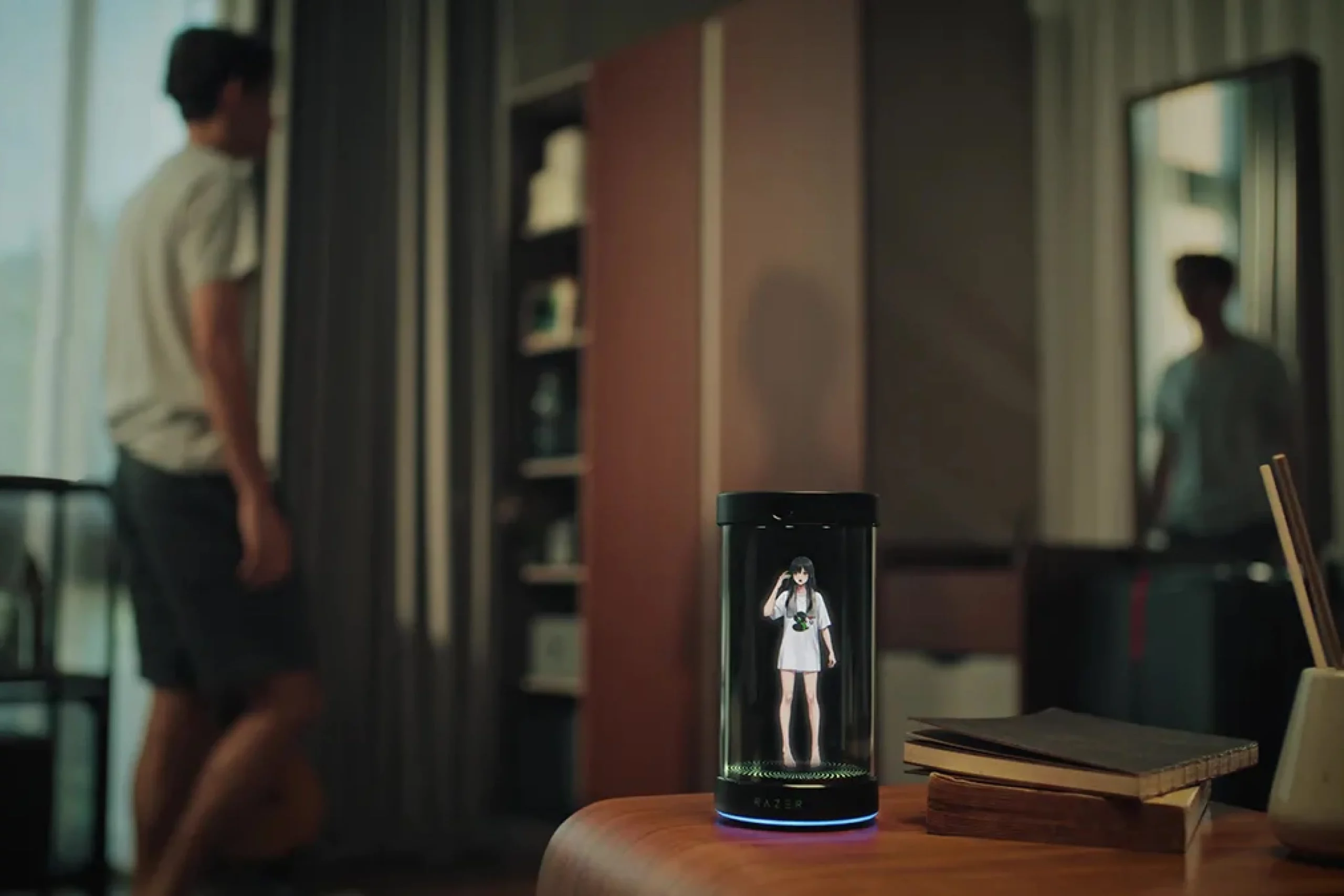 Razer Project Ava — это голографическая труба с аватаром для ИИ-ассистента. Устройство для тех, кто привык смотреть в глаза своему собеседнику. Получилась этакая умная колонка с визуальным интерфейсом. У нее есть встроенная камера, так что голографический аватар будет обращен именно к вам — немаловажно при общении.
