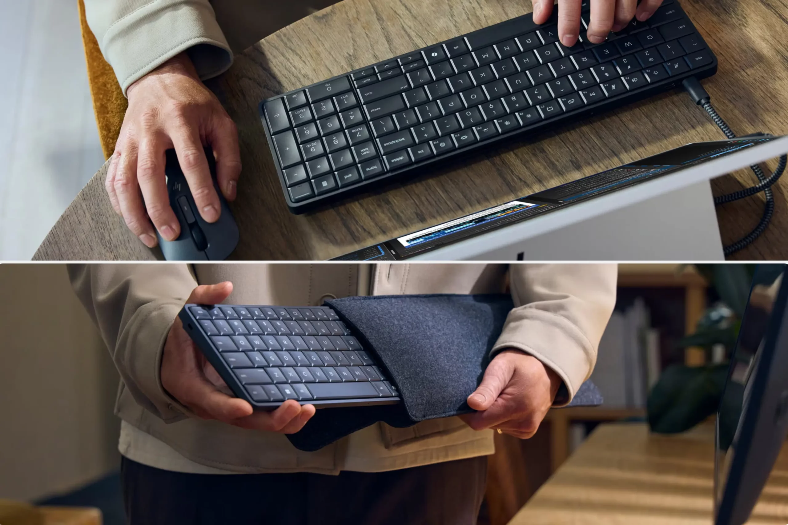 Небольшая встроенная батарея позволяет без перезагрузки переносить устройство от одного рабочего места к другому. Для подключения внешнего монитора и питания есть пара разъемов Type-C. Клавиатура влагостойкая, ее даже можно мыть!