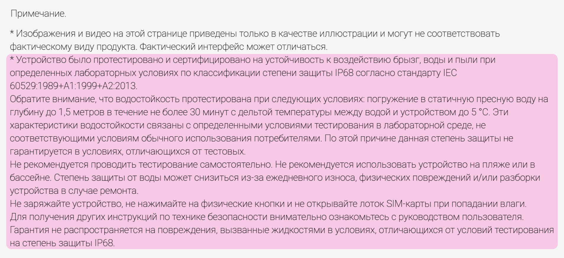 Компания Xiaomi, к примеру, для своего смартфона 13 Pro предоставляет развернутую информацию с предупреждением об устойчивости девайса к внешним воздействиям