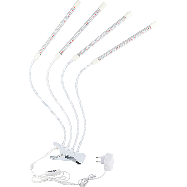 Если вы предпочитаете некрупные растения (от 10 до 20 см вместе с горшком), вам подойдут светодиодные лампы с несколькими светильниками, которые крепятся c помощью прищепки и которые можно равномерно направить на все цветы. Фитолампы-прожекторы — тоже неплохой вариант для низкорослых растений, а также для рассады.