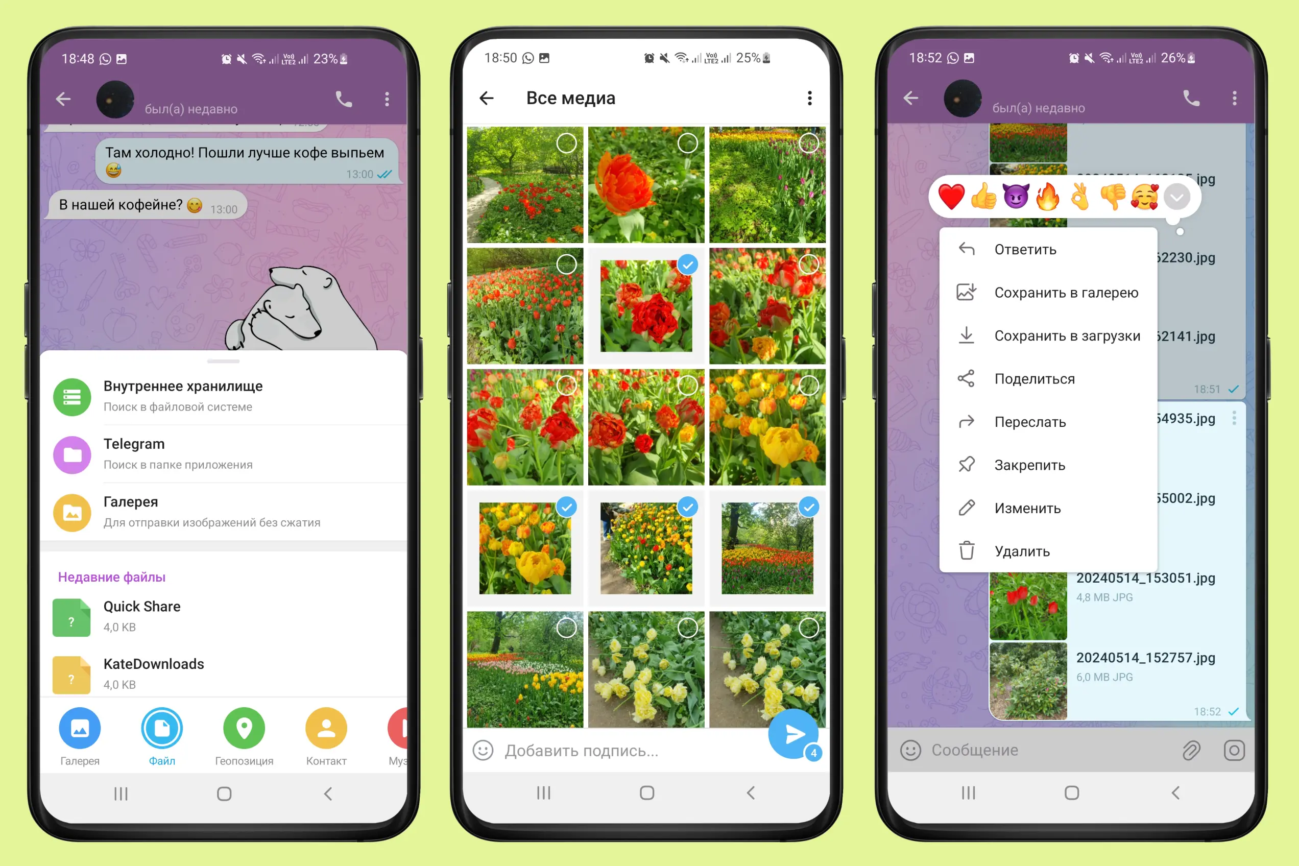 И напоследок, пожалуй, самый популярный способ перекачки фото с телефона на телефон — мессенджеры. Мы рекомендуем использовать для передачи фотографий Telegram. Все дело в том, что большинство мессенджеров (WhatsApp, Viber) «сжимают» фото перед отправкой, чтобы снизить вес файла. А вот в Telegram существует возможность отправки фото в исходном качестве. Для этого: