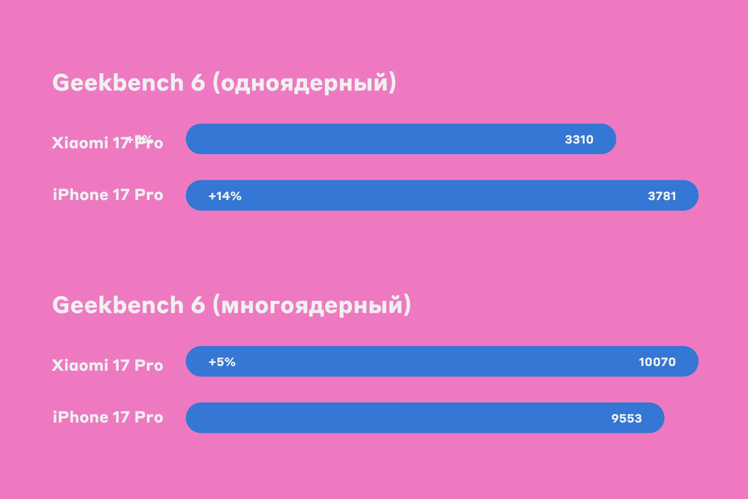 В тестах на бенчмарке AnTuTu 10 Xiaomi 17 Pro получил более высокие, чем iPhone 17 Pro, цифры — более 3,5 млн баллов против почти 2,4 млн очков. На Geekbench 6 Xiaomi 17 Pro набирает 3310 баллов в одноядерном и 10 070 баллов в многоядерном режиме. Показатели Apple iPhone 17 Pro — 3781 очко и 9553 балла.