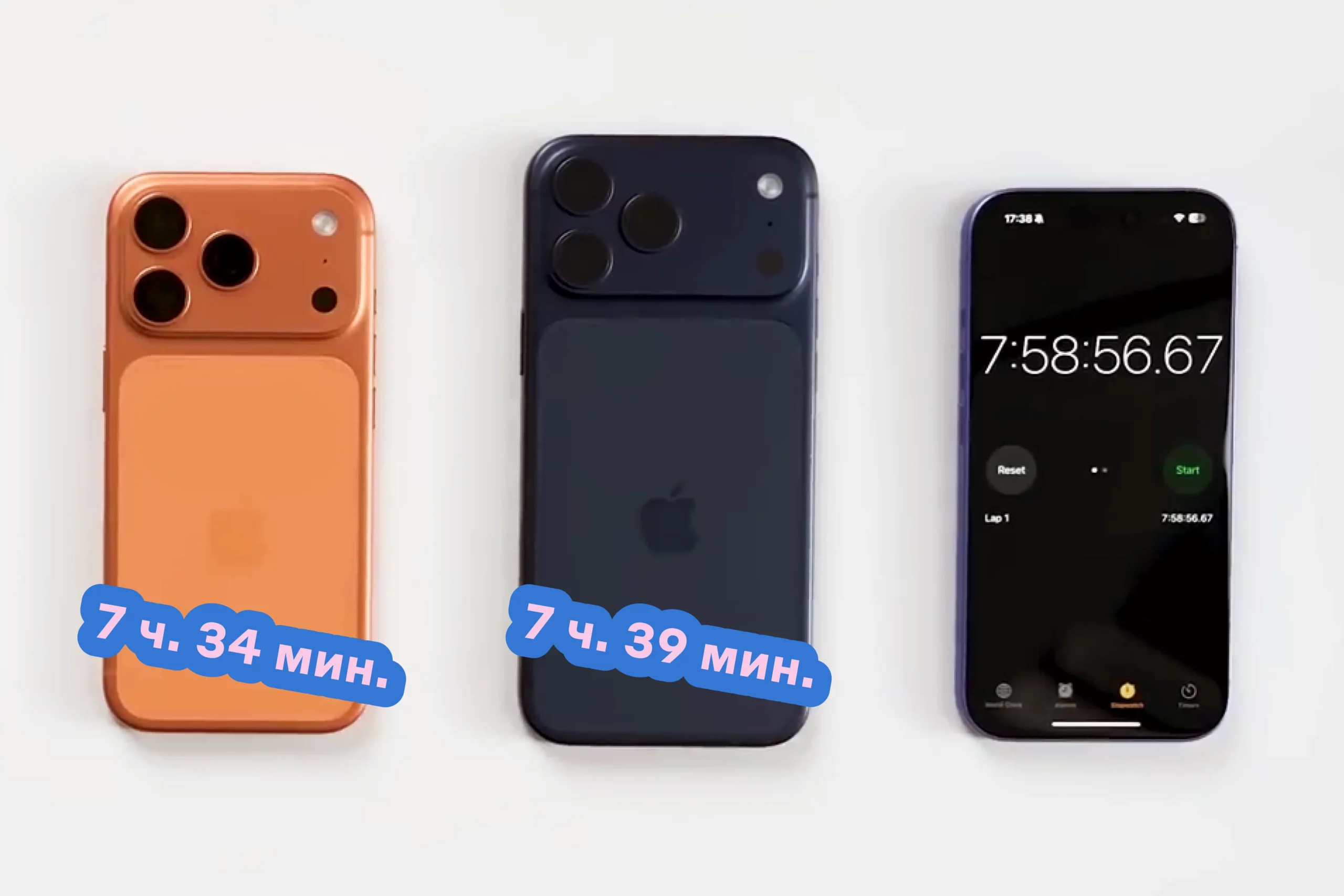 Более приближенные к реальности данные получил ютуб-блогер The Tech Chap. Он сравнил 17 Pro и 17 Pro Max в стресс-тесте автономности: играл несколько часов подряд, запускал приложения, смотрел и снимал фото и видео.