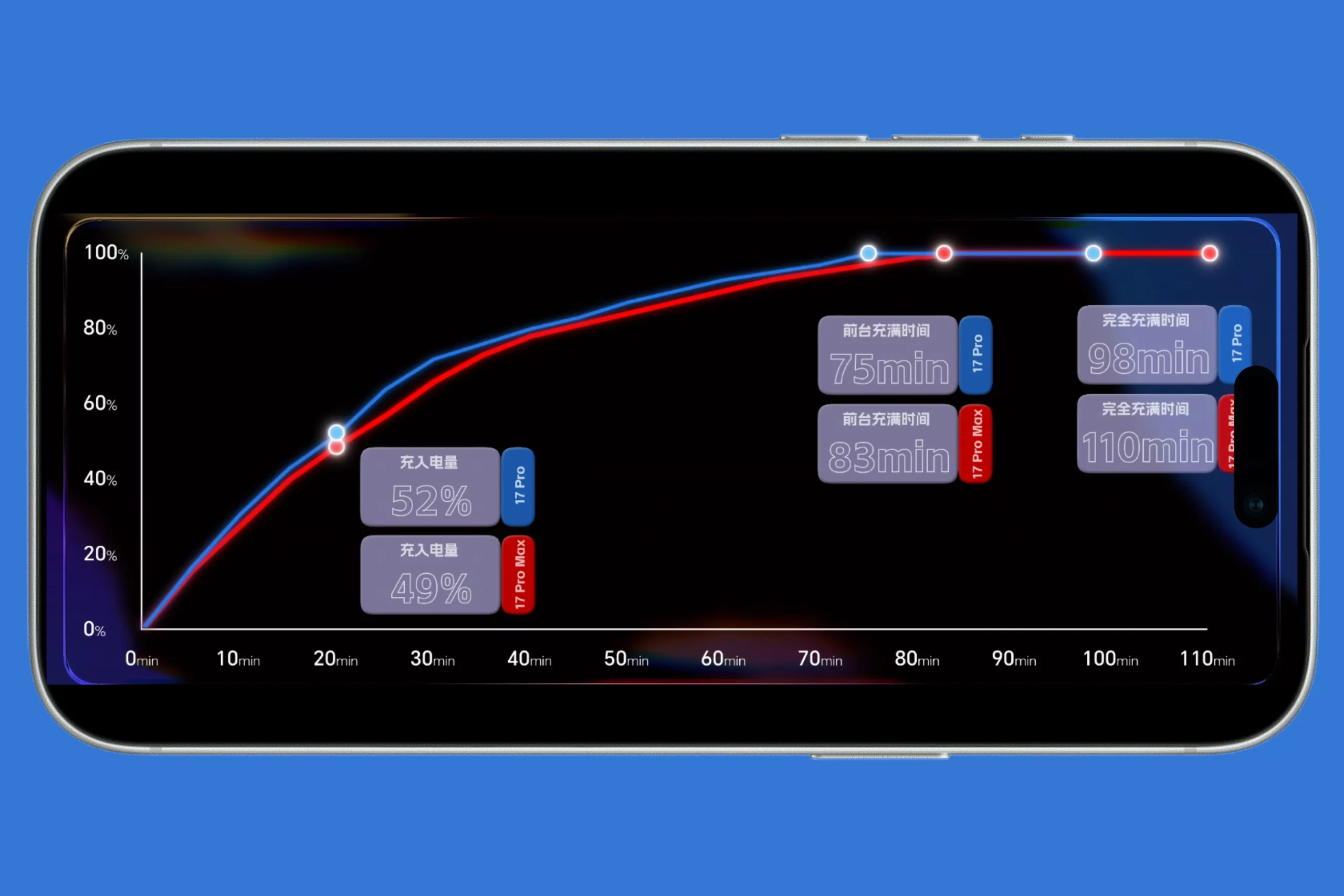 Параметры мощности быстрой зарядки совпадают, но из-за разной емкости аккумуляторов смартфонов скорость разная. По замерам блогеров из Китая, 17 Pro полностью заряжается от стандартного 40-ваттного адаптера Apple за 1 час и 38 минут, а Pro Max — за 1 час и 48 минут. За 20 минут у розетки они зарядились на 52% и 49% соответственно.