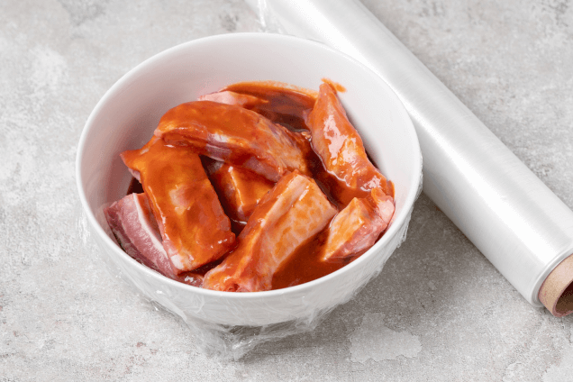 Шаг 3. Переложите в маринад ребрышки и встряхните так, чтобы маринад хорошо покрыл все кусочки со всех сторон. Затяните миску пленкой и поставьте в холодильник минимум на 6−8 часов. А лучше на всю ночь.