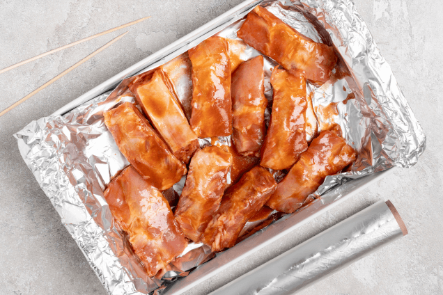 Шаг 4. Достаньте форму для запекания и застелите ее фольгой. Выложите ребрышки в один слой. Не кладите кусочки один на другой. Фольгу сверху заверните и сделайте пару проколов зубочисткой. Не экономьте на фольге. Этот пункт кажется незначительным, однако от качества фольги при запекании зависит и качество готового блюда. Кстати, разворачивать фольгу во время приготовления можно и даже нужно, чтобы проверить пропекание мяса.