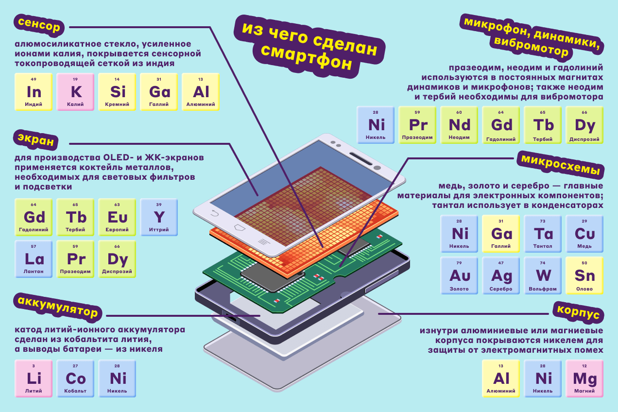 При создании смартфона используется около 40 химических элементов. Вот самые популярные из них, по данным Бирмингемского университета