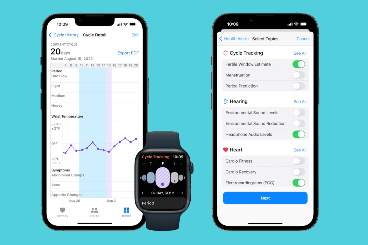 Первым продемонстрированным гаджетом стали Apple Watch Series 8. Разговор об этих часах начался с новых функций: очень много внимания уделили трекингу женского цикла и объяснению, почему это так важно. Для его отслеживания и предсказания используются новые датчики часов, в частности, для измерения температуры тела.