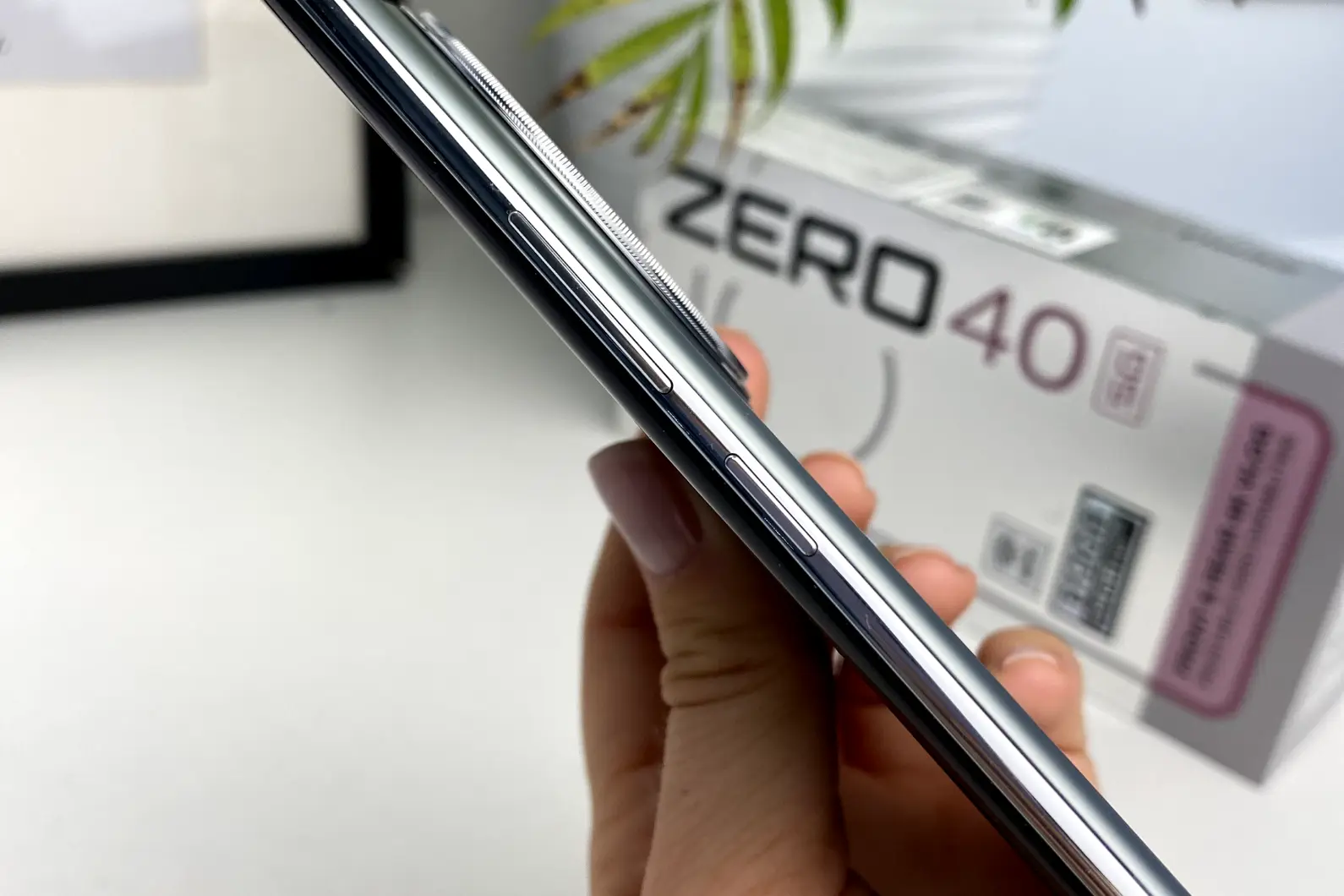 Устройство поместили в стеклянный корпус, который отлично сочетается с экраном-водопадом. Круглый островок камер обрамлен мерцающей рамкой и не утяжеляет смартфон. ZERO 40 5G выпустили в трех оттенках: «Нежный фиалковый», «Каменный черный» и «Энергичный титановый». Корпус сделали тонким и легким, его вес — 195 г, а ширина — 7,9 мм.