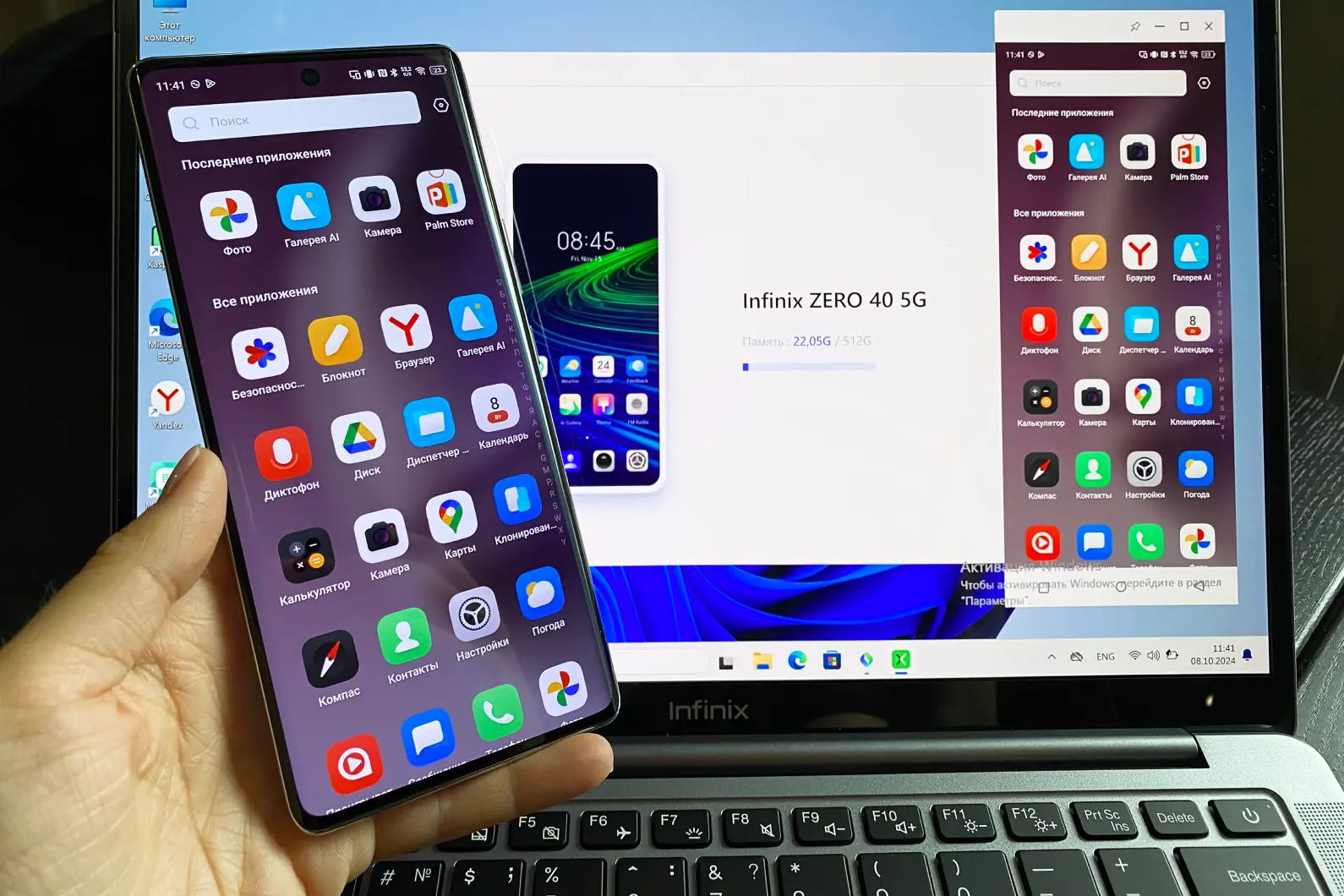 Выше мы рассмотрели систему передачи файлов между планшетом XPAD и смартфоном ZERO 40 5G. В Infinix INBOOK Air Pro+ такая функция, конечно, есть, но также появилась дополнительная возможность взаимодействия со смартфонами бренда. Благодаря поддержке Infinix PC Connection можно транслировать экран телефона на экран ноутбука. Особенно пригодится такая опция тем, кто одновременно работает на двух устройствах. Подключиться можно буквально в два клика: