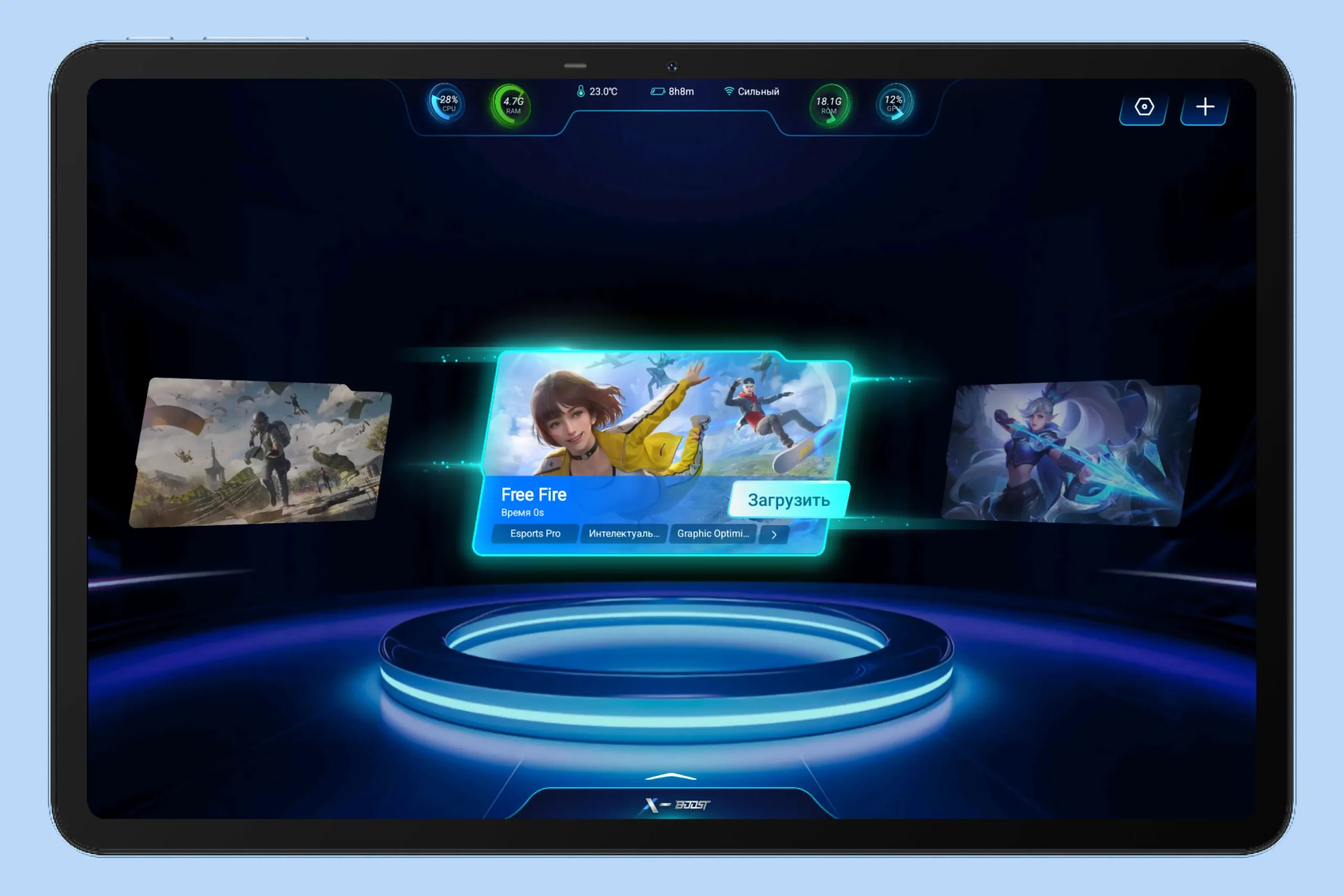 Мобильный гейминг — то, ради чего создан этот планшет. Заметно это буквально сразу после включения. Одна из главных иконок здесь — это игровое пространство XArena, где сразу же можно загрузить игру, а также выбрать для нее нужный режим: энергосберегающий, эквилибриум и производительный.