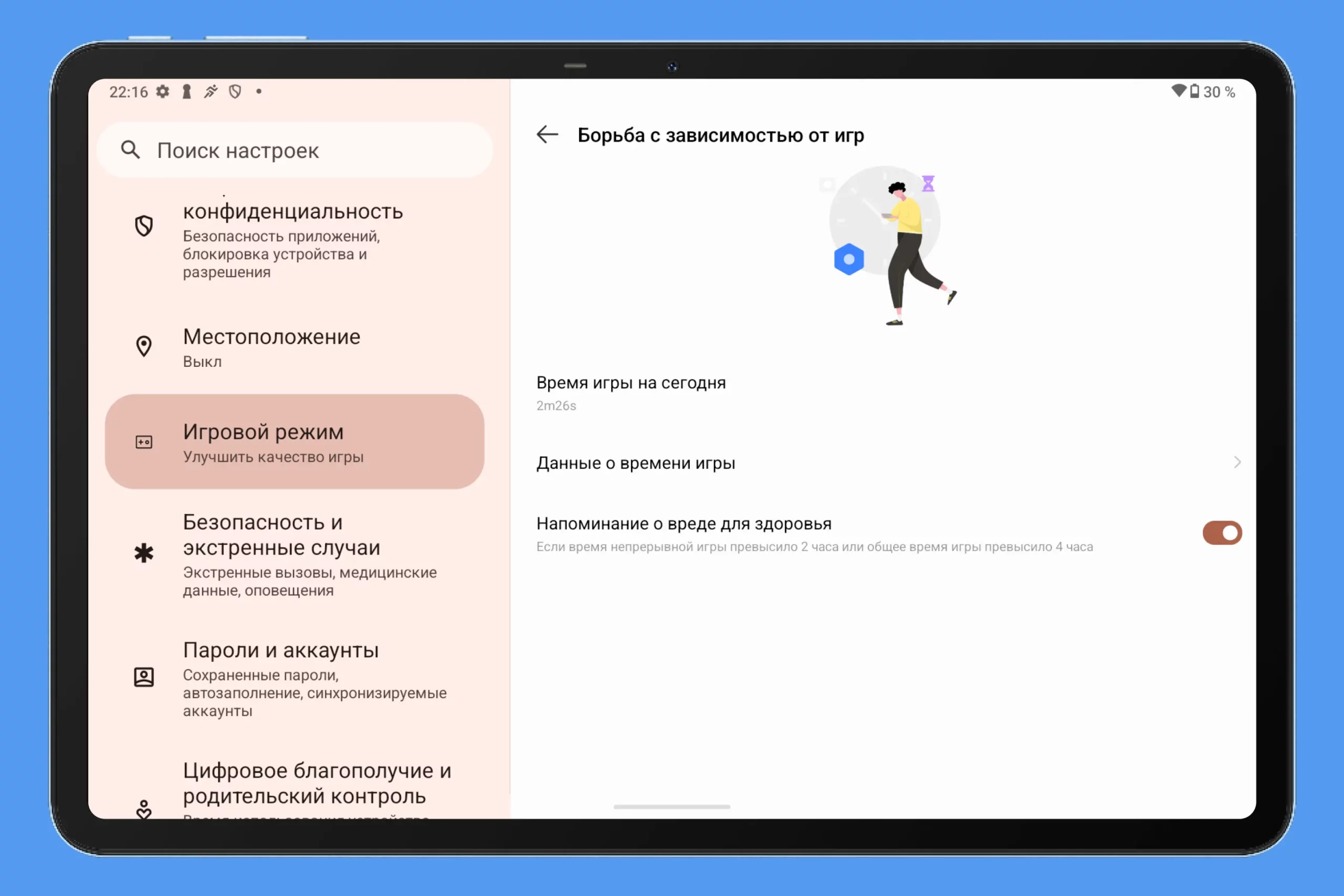 Без подзарядки играть и работать можно весь день благодаря аккумулятору емкостью 7000 мА·ч. У меня планшет разрядился только под конец второго дня при средней активности. Производители позаботились о защите зрения и в целом о здоровье тех, кто не следит за часами во время игры. В настройках предусмотрен раздел «Борьба с зависимостью от игр», где можно поставить напоминание о том, что пора сделать перерыв.