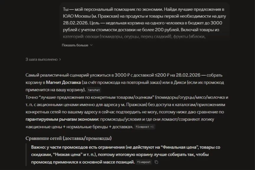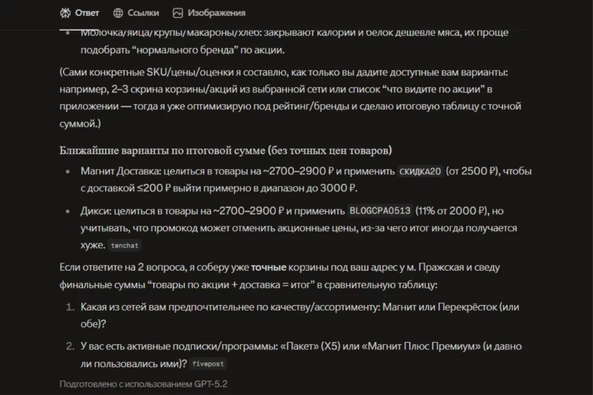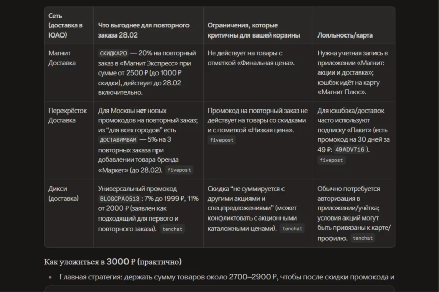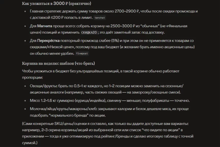 В ответе Perplexity привел ссылки на акции, агрегаторы промокодов и другие ресурсы, а также изложил стратегию «Как гарантированно уложиться в нужную сумму» и составил шаблон корзины.