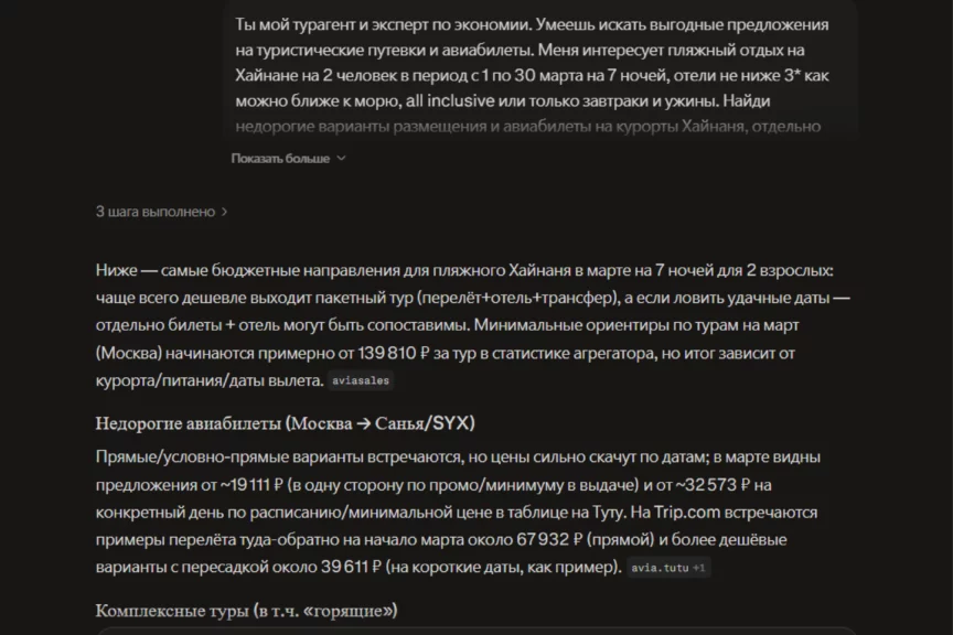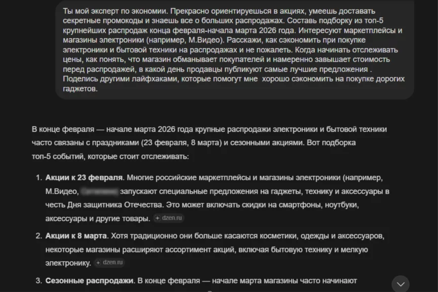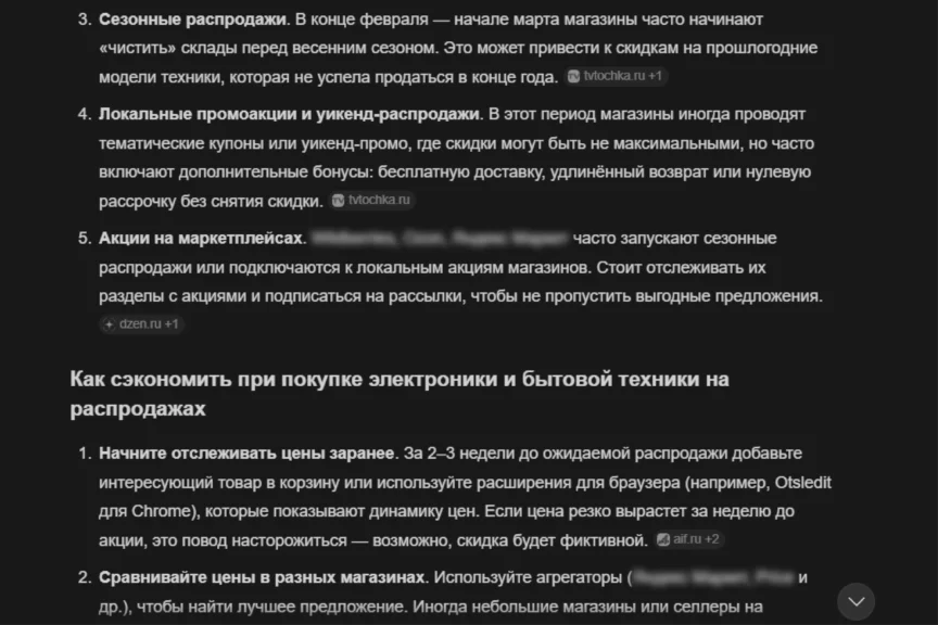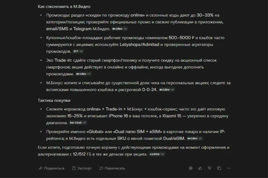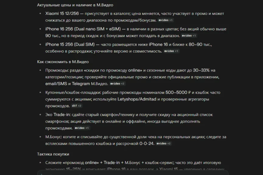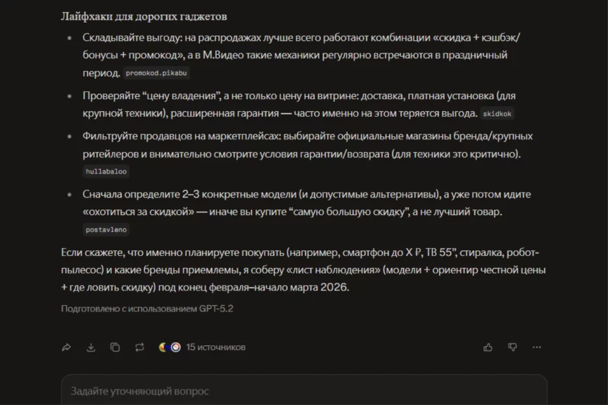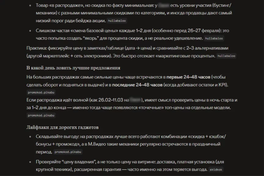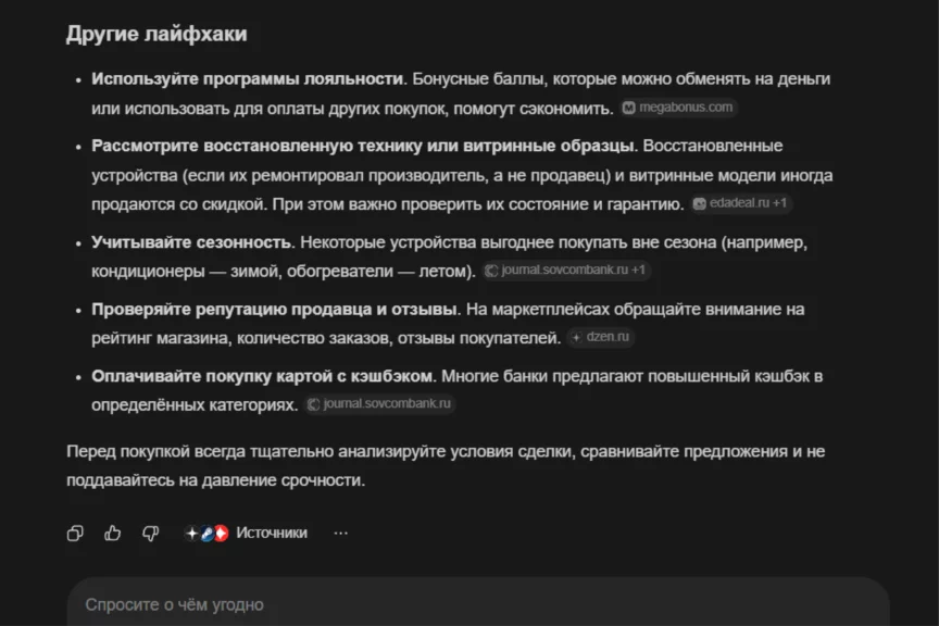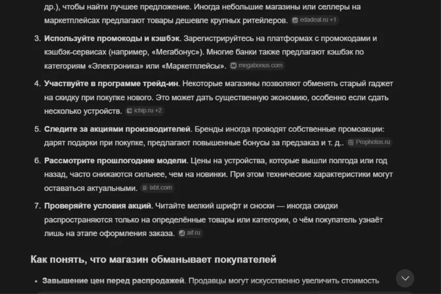 В целом, ИИ полезен как помощник: ускоряет разведку, подсказывает тайминг распродаж и собирает варианты экономии, но финальные решения стоит принимать только после сверки итоговой цены, условий и сроков на сайтах продавцов и в приложениях.