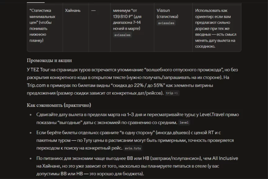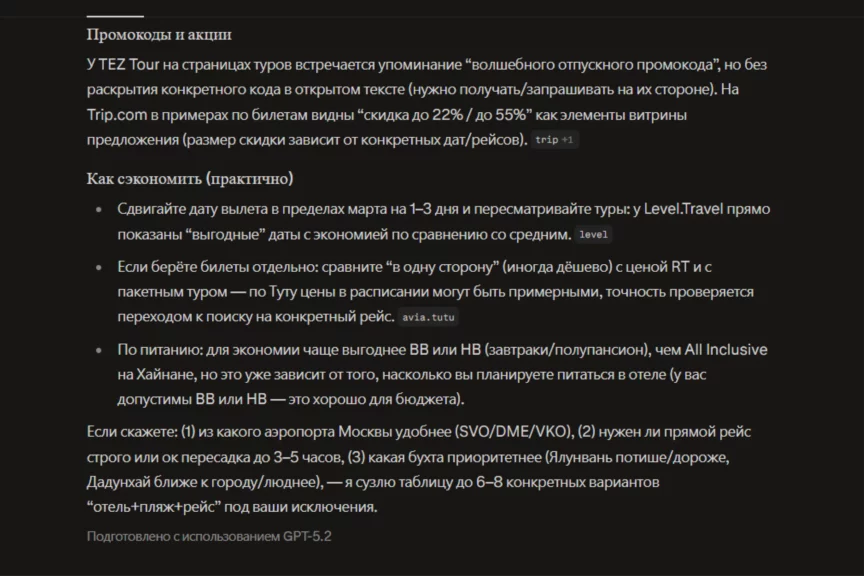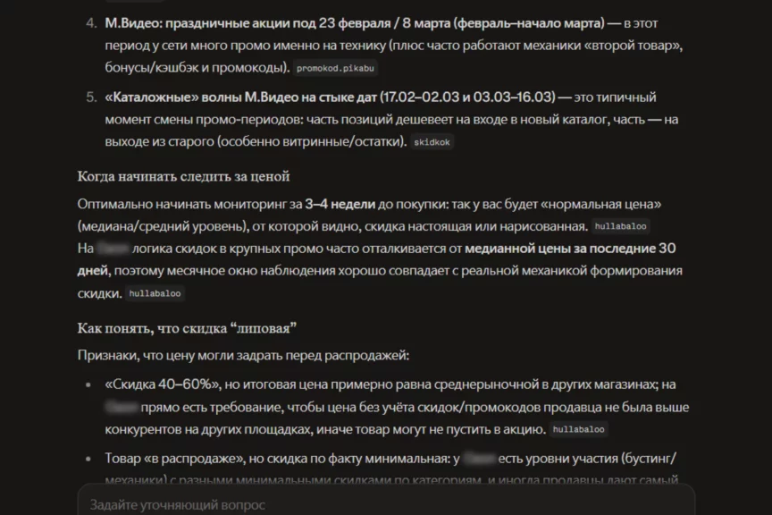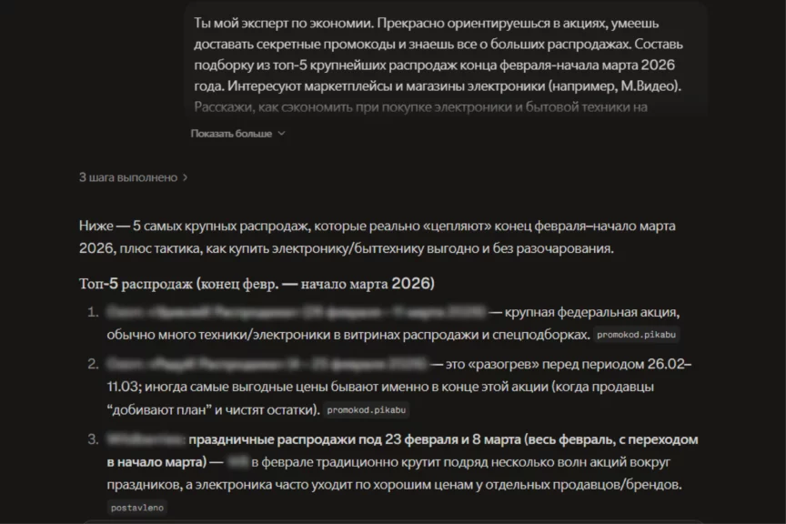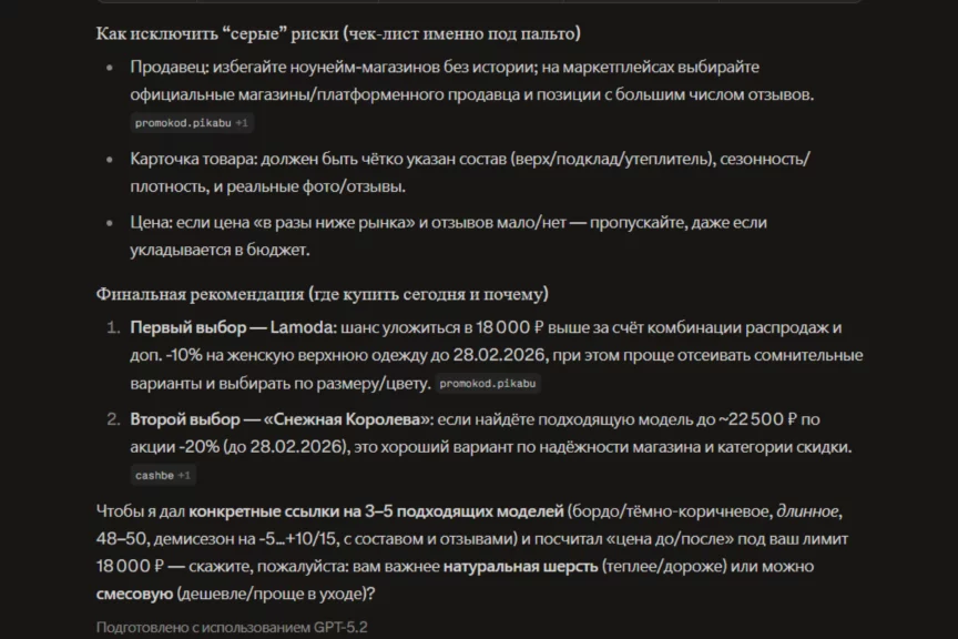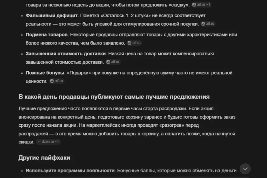 - Критически оценивайте ответы ИИ и ищите подтверждения: ссылки, условия акций, действующие промокоды; часть фактов иногда придется проверять вручную.