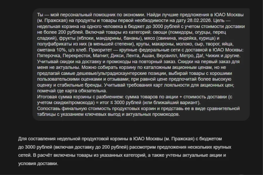 Чтобы проверить, действительно ли нейросети могут стать вашим личным шопинг-агентом и помощником по экономии, мы устроим небольшой эксперимент. Отправим искусственный интеллект в виртуальный поход по разным магазинам — от супермаркетов до онлайн-маркетплейсов и туристических агентов. Цель — выяснить, насколько ИИ способен находить выгодные предложения, подбирать скидки и советовать, когда стоит дождаться распродаж.