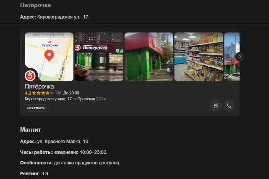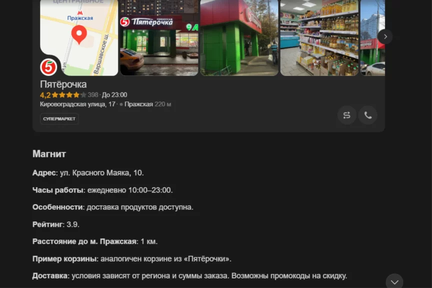 Ты — мой персональный помощник по экономии. Найди лучшие предложения в ЮАО Москвы (м. «Пражская») на продукты и товары первой необходимости на дату