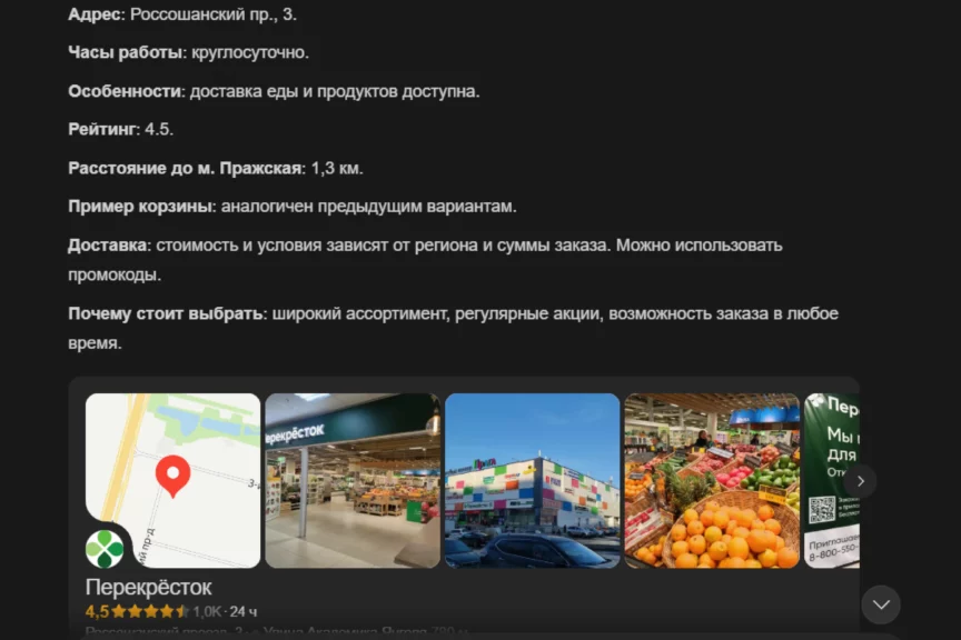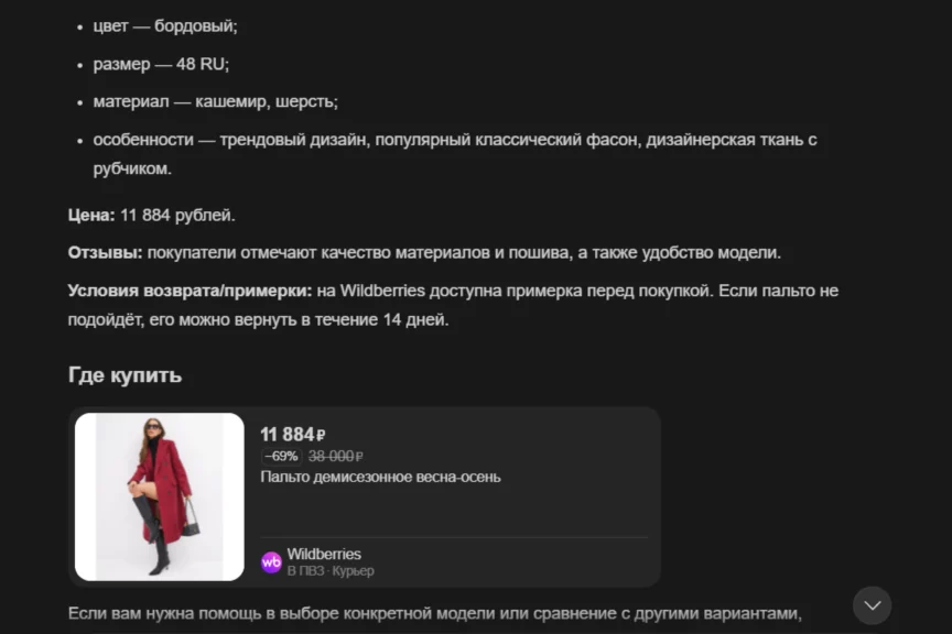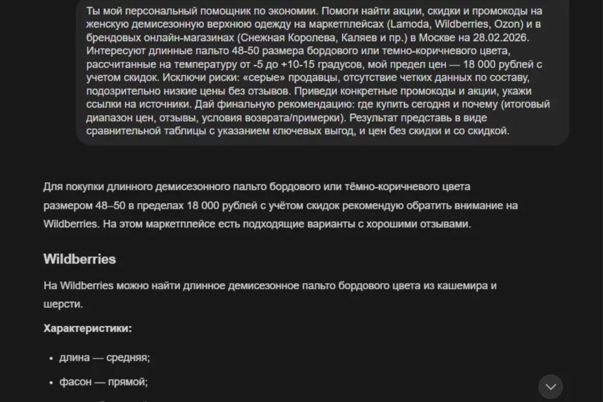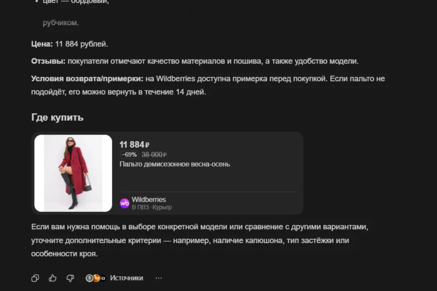 Perplexity с ChatGPT дает более точные и проверяемые ответы за счет ссылок и структуры. Алиса от «Яндекса» не отстает, но ей иногда не хватает полноты ответа (как в случае с пальто). В обоих случаях важно перепроверять ключевые факты по первоисточникам и корзине.