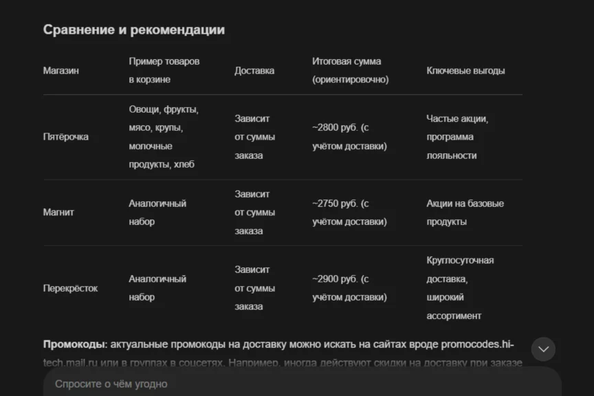 Идем с тем же запросом к Алисе от «Яндекса». В своем ответе она составила список магазинов с адресами и привела примеры корзины, добавила сравнительную таблицу торговых сетей, список агрегаторов промокодов и рекомендации по экономии. В конце ответа можно найти все ссылки на источники, а для получения развернутых рекомендаций — уточнить запрос.