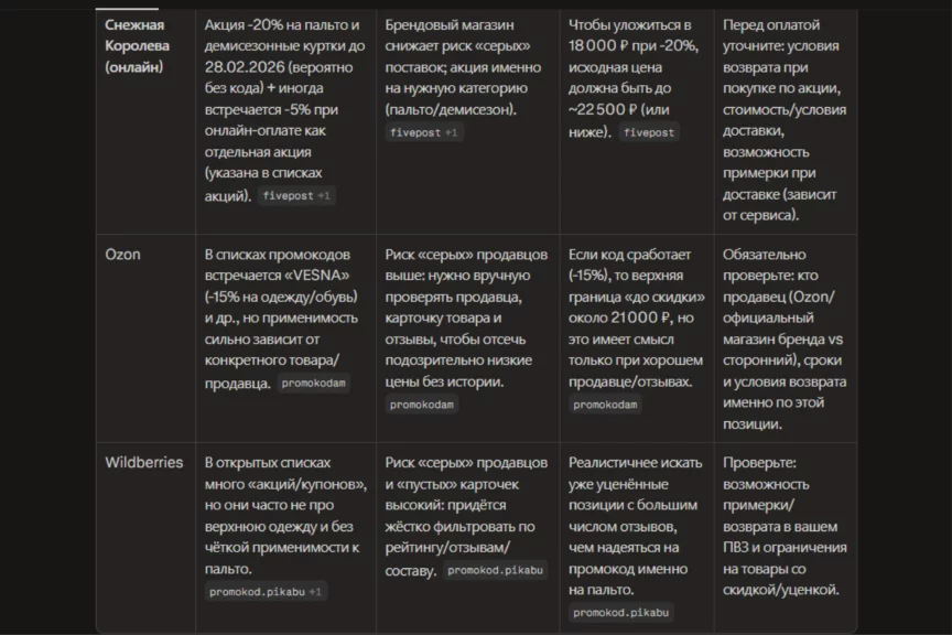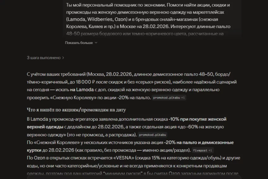 Ты — мой персональный помощник по экономии. Помоги найти акции, скидки и промокоды на женскую демисезонную верхнюю одежду на маркетплейсах (Lamoda, Wildberries, Ozon) и в брендовых онлайн-магазинах («Снежная Королева», «Каляев» и пр.) в Москве