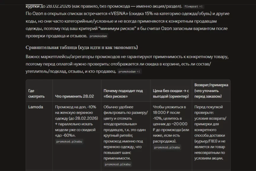 Perplexity с ChatGPT составил сравнительную таблицу с акциями разных магазинов, указал цену, риски и преимущества заказа. Также подсказал, как сэкономить, и предложил сузить поиск до конкретных моделей/цветов одежды. Точных ссылок на товары и бренды ИИ не дал.