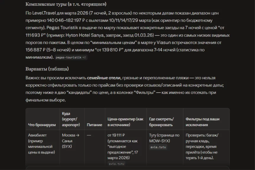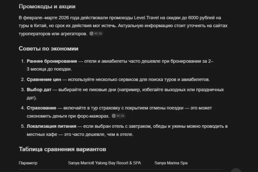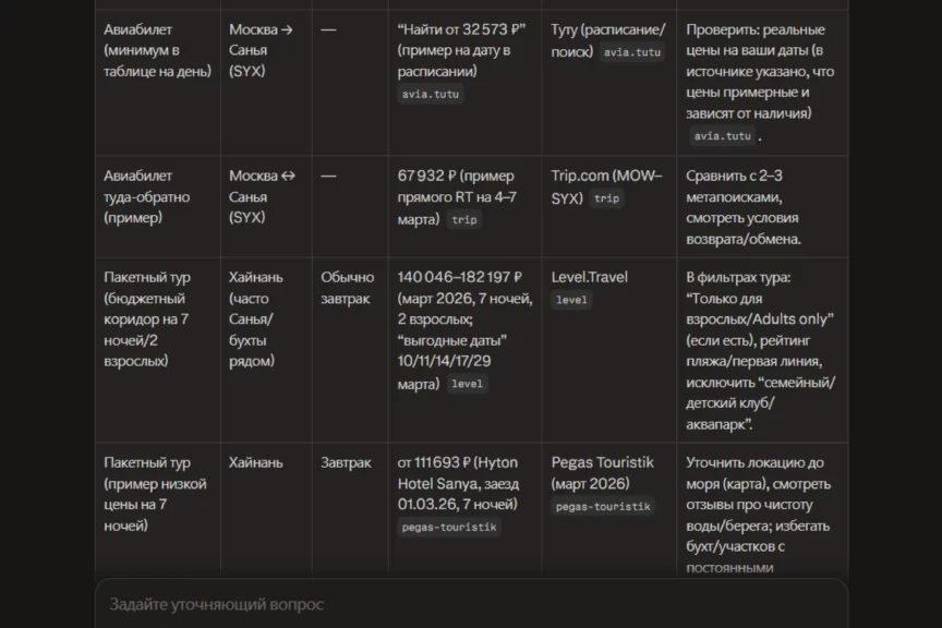 ChatGPT составил внушительную сравнительную таблицу с авиабилетами, турами и отелями и подсказал, как сэкономить. Можно развить диалог, ответив на вопросы нейросети, — и тогда она подберет варианты более точечно.