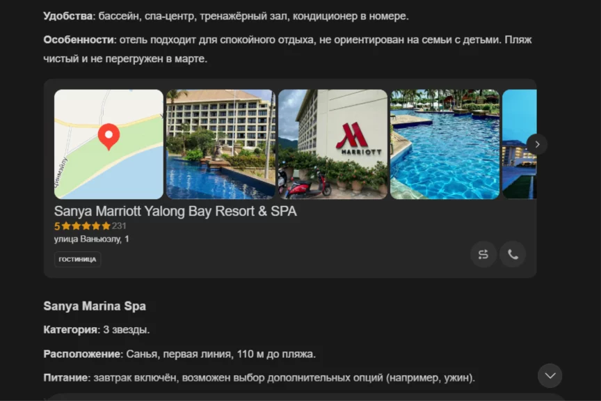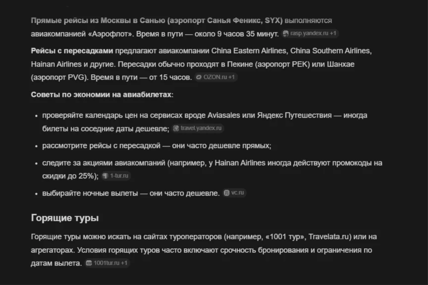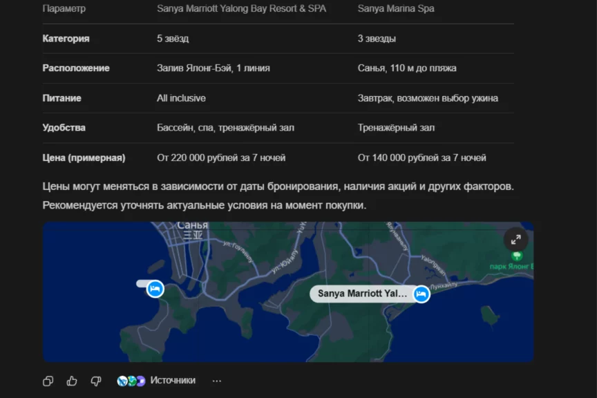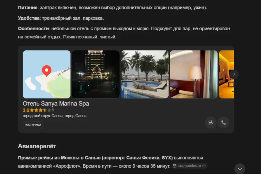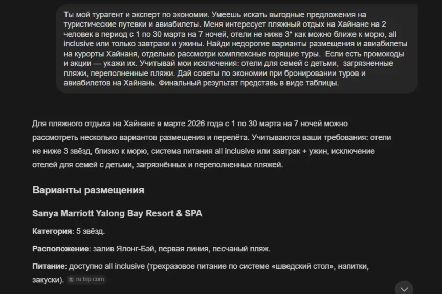 Алиса тоже ответила развернуто — с рекомендациями, подборкой отелей, ценами. Указала сервисы, где действуют скидки на бронирование, дала советы по экономии. В ответе есть подборка ссылок — все можно проверить.