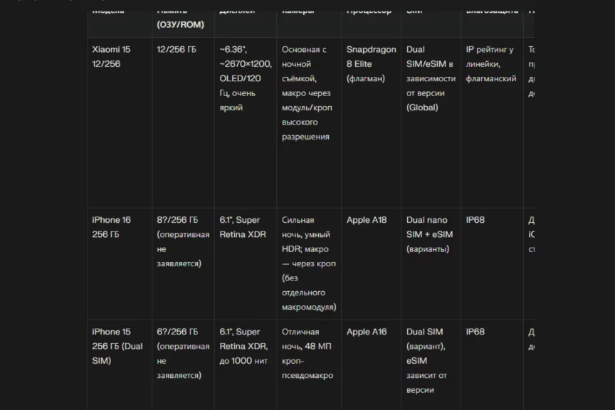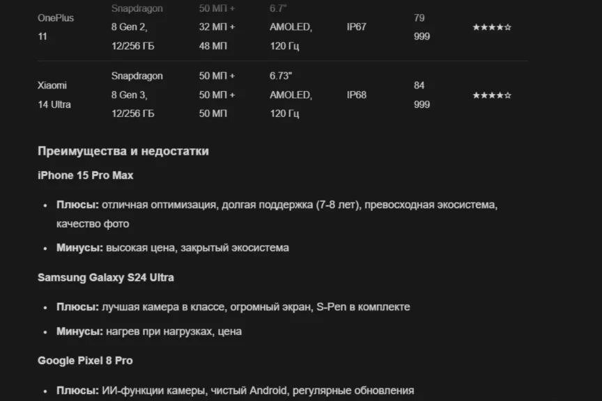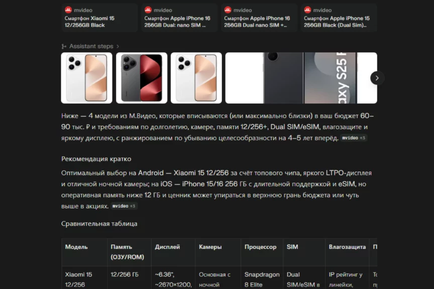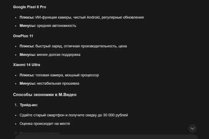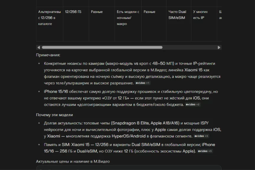 На этом фоне ответ Алисы с красивыми звездочками в таблице показался даже выигрышным. И остался бы таковым, если бы она не ошиблась с ценами и не внесла в таблицу товары, которых нет в каталоге «М.Видео», например Google Pixel 8 Pro.