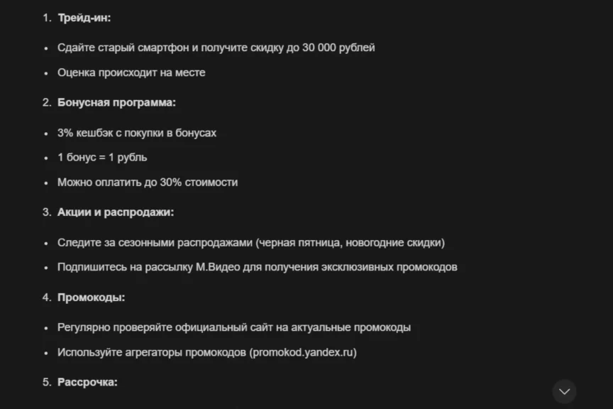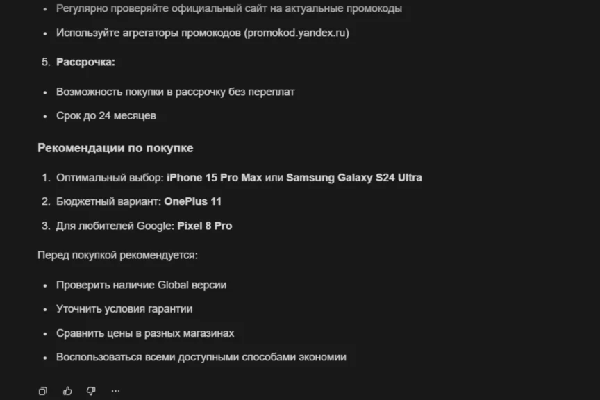 Алиса также дала очень емкие и полезные инструкции, хотя некоторые из них противоречат ответу ChatGPT (например, о самых выгодных ценах). А в конце даже предостерегла от импульсивных решений во время ажиотажа и напомнила о важности планирования крупных покупок.