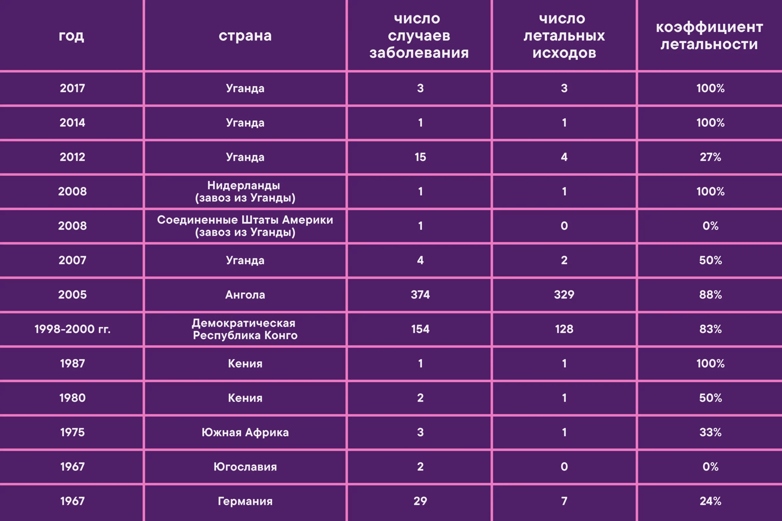 Вирус Марбург — один из самых смертоносных из семейства филовирусов (к этому семейству относится также вирус Эбола). Эти вирусы вызывают у заболевших тяжелую геморрагическую лихорадку и характеризуются высокой летальностью. Природным резервуаром инфекции Марбург являются плодоядные летучие мыши — например, крыланы, которые могут передавать вирус человеку. Вспышки болезни за все время ее существования регистрировались именно в африканских странах — Демократической Республике Конго, Анголе, Уганде, а в 2024 году — в Руанде.
