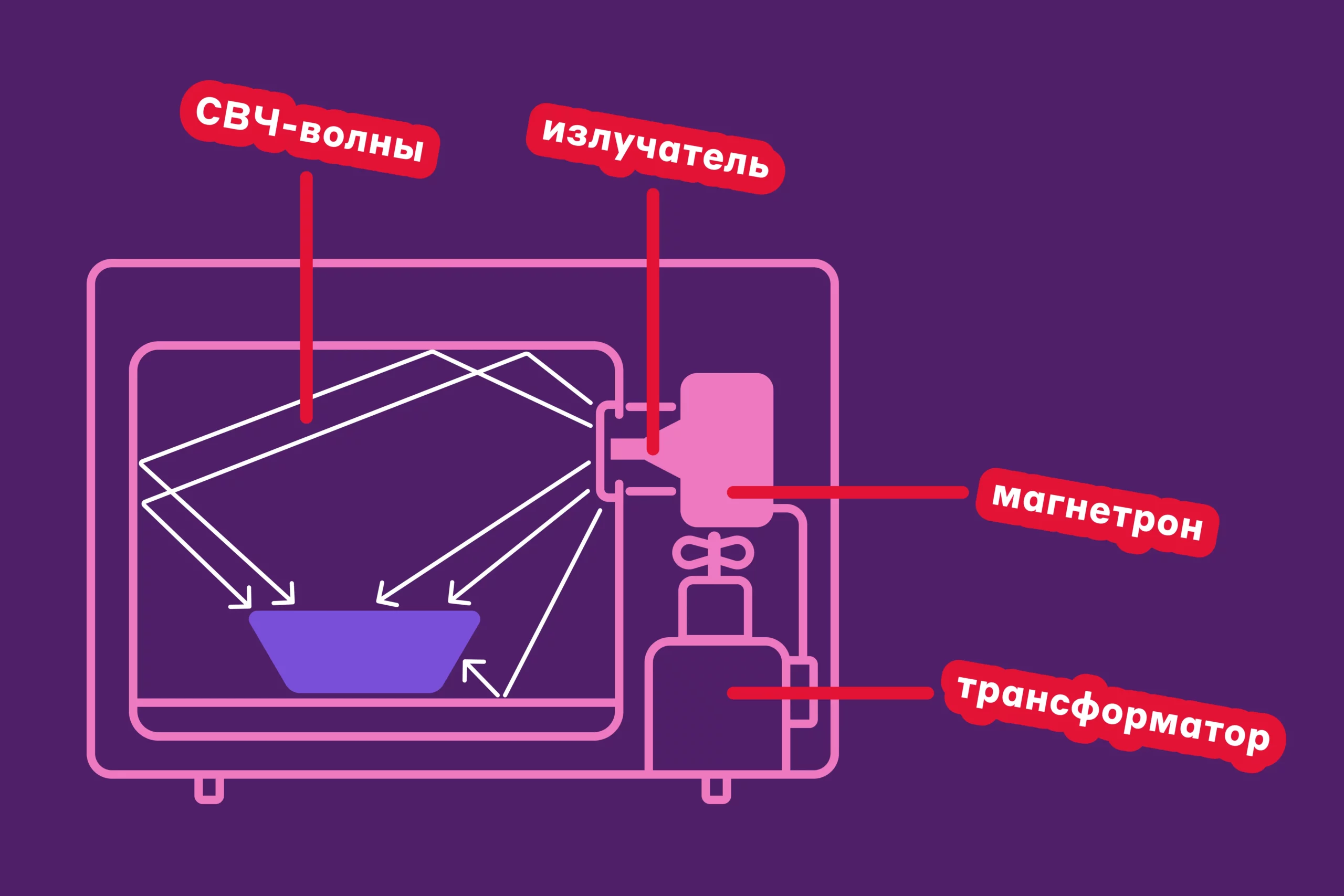 Как работает микроволновка? В этом процессе нет ничего загадочного. Когда вы включаете печь, устройство нагревает еду с помощью электромагнитного излучения — тех же радиоволн, что и у Wi-Fi. Только они мощнее и направлены внутрь камеры. Волны заставляют молекулы воды двигаться, от этого появляется тепло, и продукт прогревается изнутри.