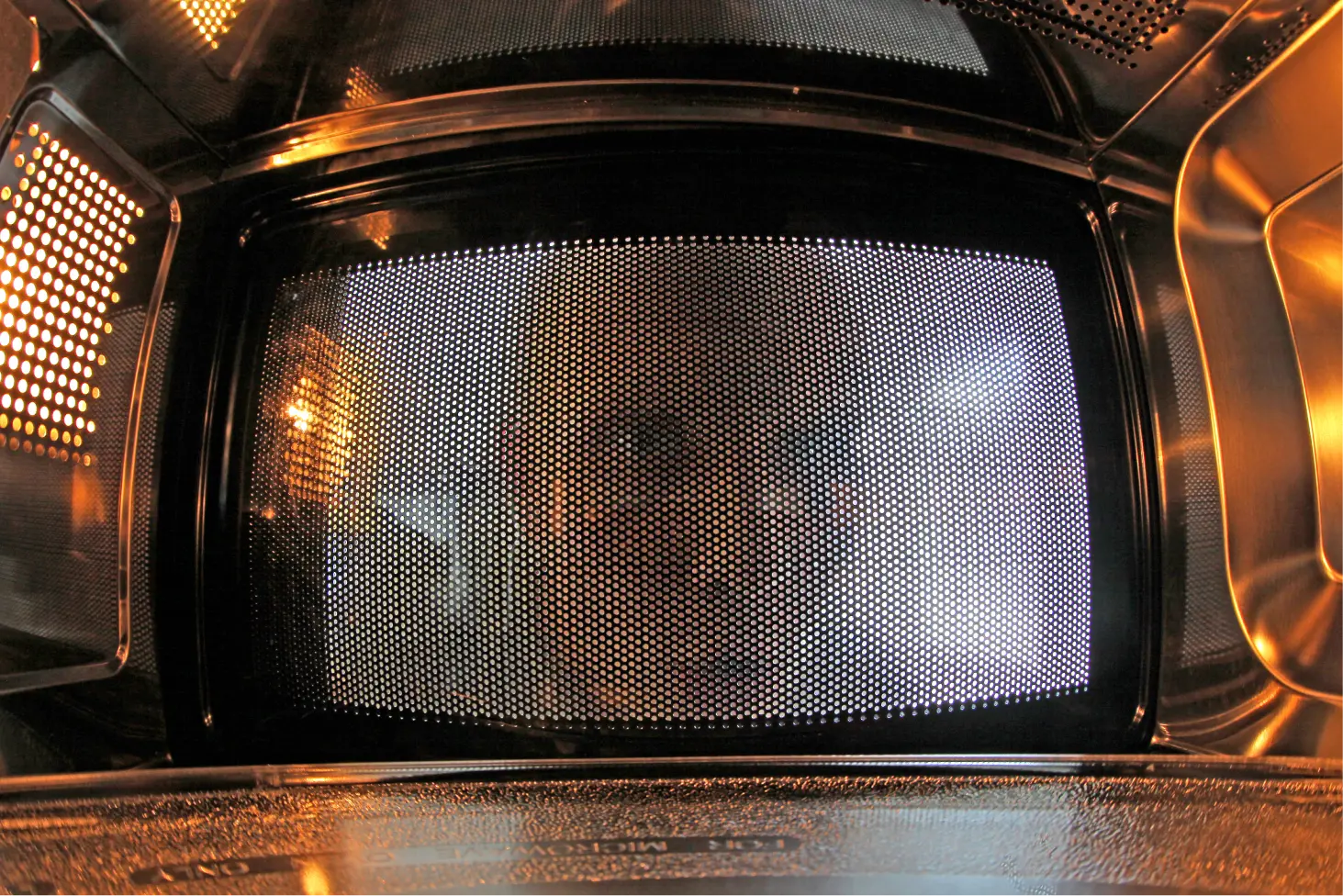 Если присмотреться к стеклу на дверце микроволновки, то можно заметить небольшие точки, и это вовсе не элемент дизайна и не вентиляция, а продуманная защита. Металлическая сетка выполняет роль экрана, который не пропускает волны наружу.