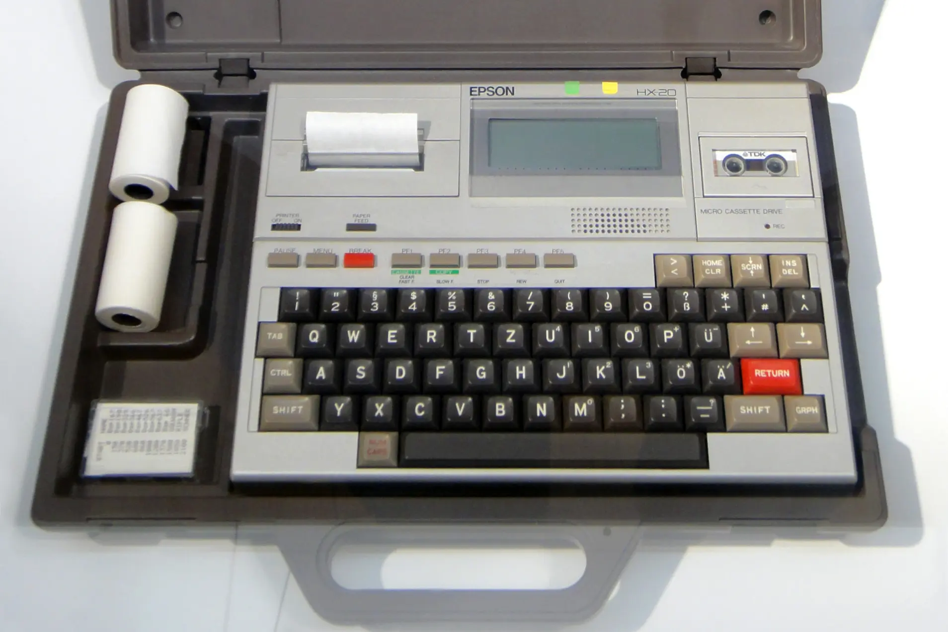 В 1981-м был представлен не только IBM PC, но и первый в истории лэптоп — компьютер, который мог работать от батареи, весил всего 1,6 кг и умещался буквально на коленях пользователя. Девайс назывался Epson HX-20, создали его в Японии. Но с ним была проблема, даже несколько. Во-первых, его LCD-экран был монохромным и позволял отображать 4 строчки по 20 символов (при разрешении 120×32 пикселя), во-вторых, у него не было операционной системы в привычной нам сегодня форме, а все взаимодействия с ним осуществлялись с помощью языка EPSON BASIC; накопителем данных служила микрокассета. При этом он был оборудован встроенным матричным принтером, мог работать до 50 часов без подзарядки, имел в комплекте простейший текстовый редактор и поддерживал подключение внешних устройств, в том числе монитора. Но публике он не понравился в силу ограниченных возможностей, даже несмотря на низкую цену (всего 795 долларов).
