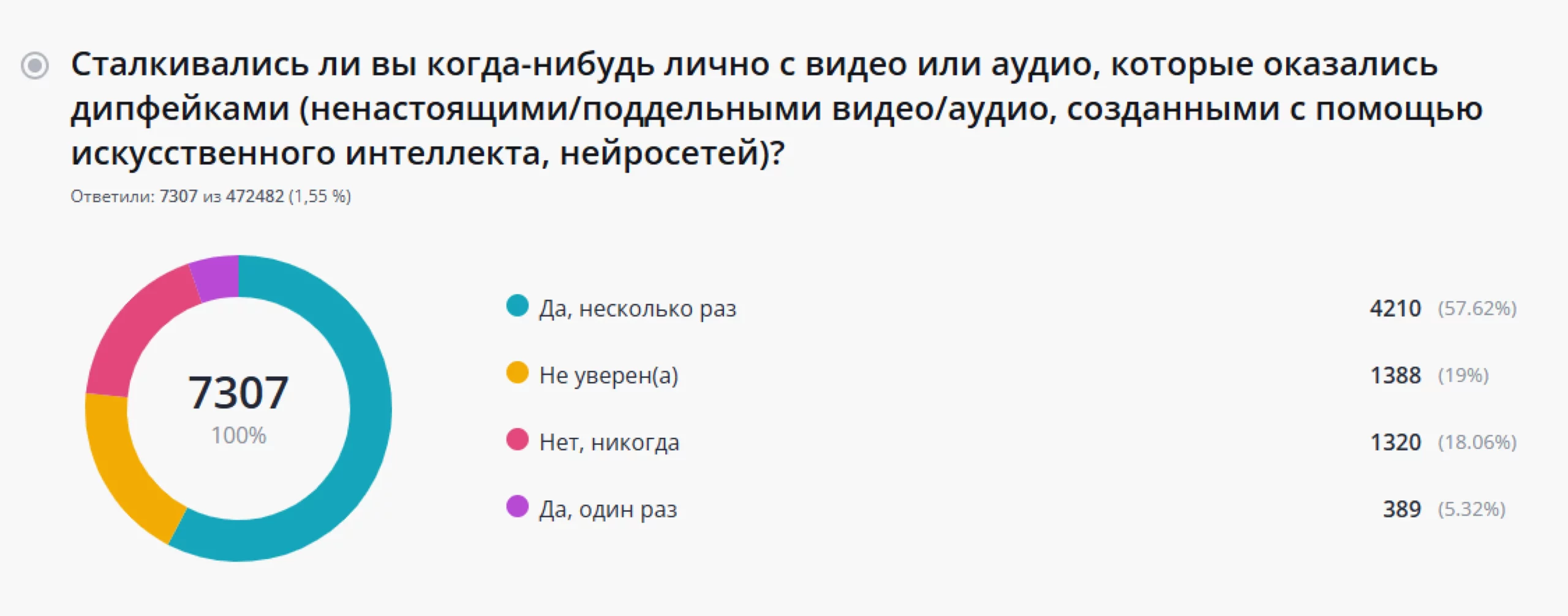 Но дальше интереснее. На следующий вопрос о том, сталкивались ли участники опроса с дипфейками лично, подавляющее большинство (57,6%) ответили, что да, причем не единожды. Вот это наплодили подделок! Тех, кто не уверен, дипфейки это были или нет, — 19%, а вот тех, кто никогда не видел такой фальшивый контент, — всего 8%.