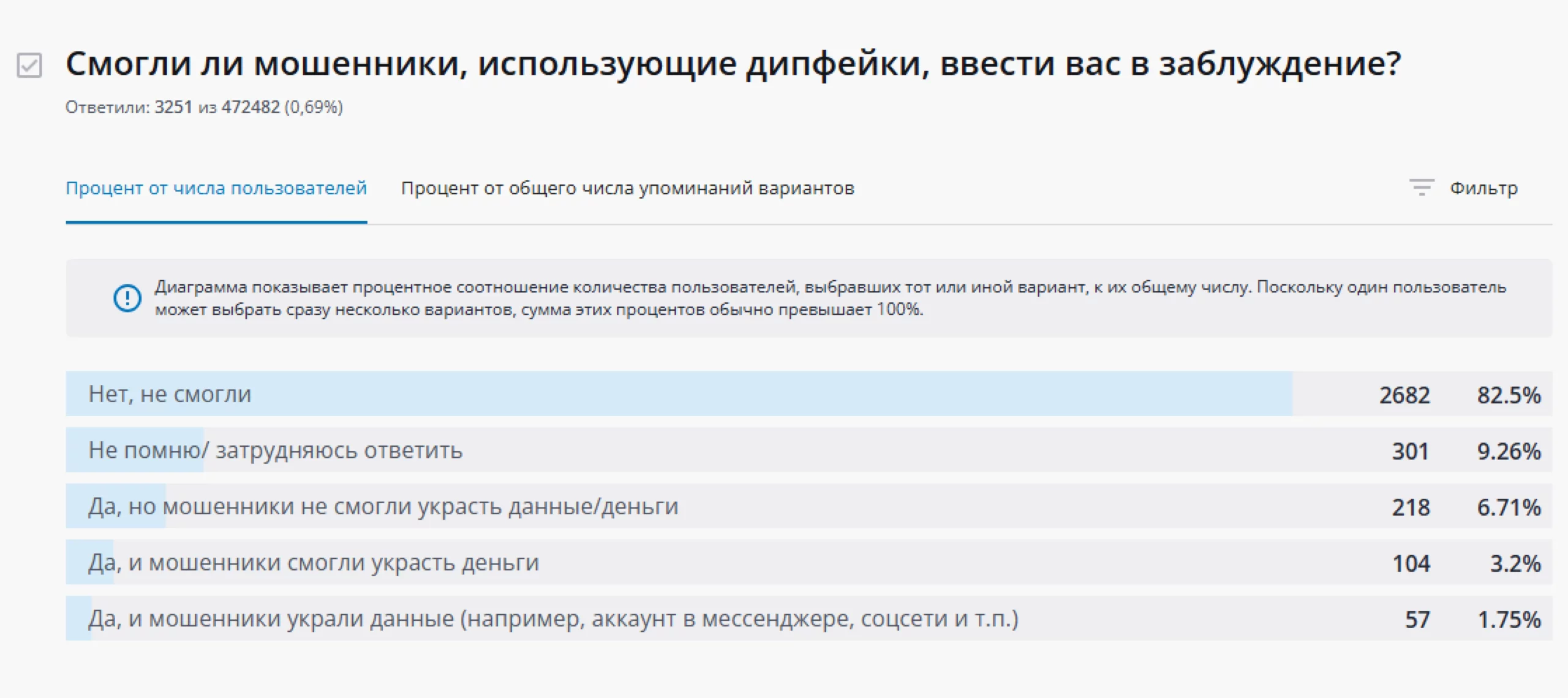 Кто-то все же поверил, но ничего ценного не лишился — таких 6,7%. А вот некоторым не повезло: у 3,2% опрошенных злоумышленники смогли украсть деньги, а у 1,8% — персональные данные.